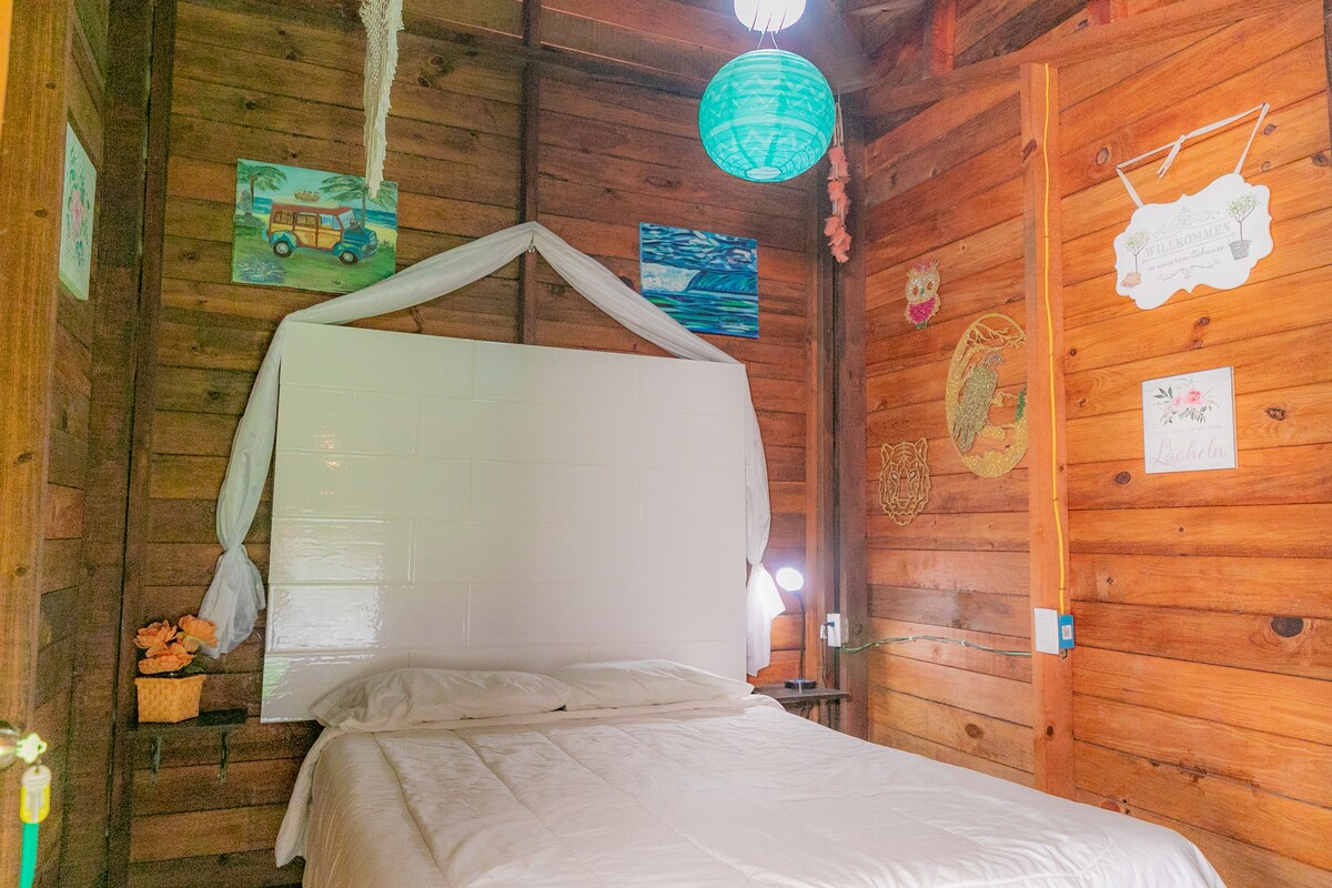 Sumérgete en una experiencia única en nuestra cabaña Colibrí, una acogedora suite enclavada en el corazón de la selva de Bacalar. Decorada con obras de arte exclusivas y detalles de diseño personalizados, esta cabaña te invita a desconectar y disfrutar de la naturaleza en un entorno sereno y creativo. Todos los rincones de la cabaña irradian tranquilidad y arte, ofreciendo una estancia inolvidable en la Laguna de los Siete Colores.