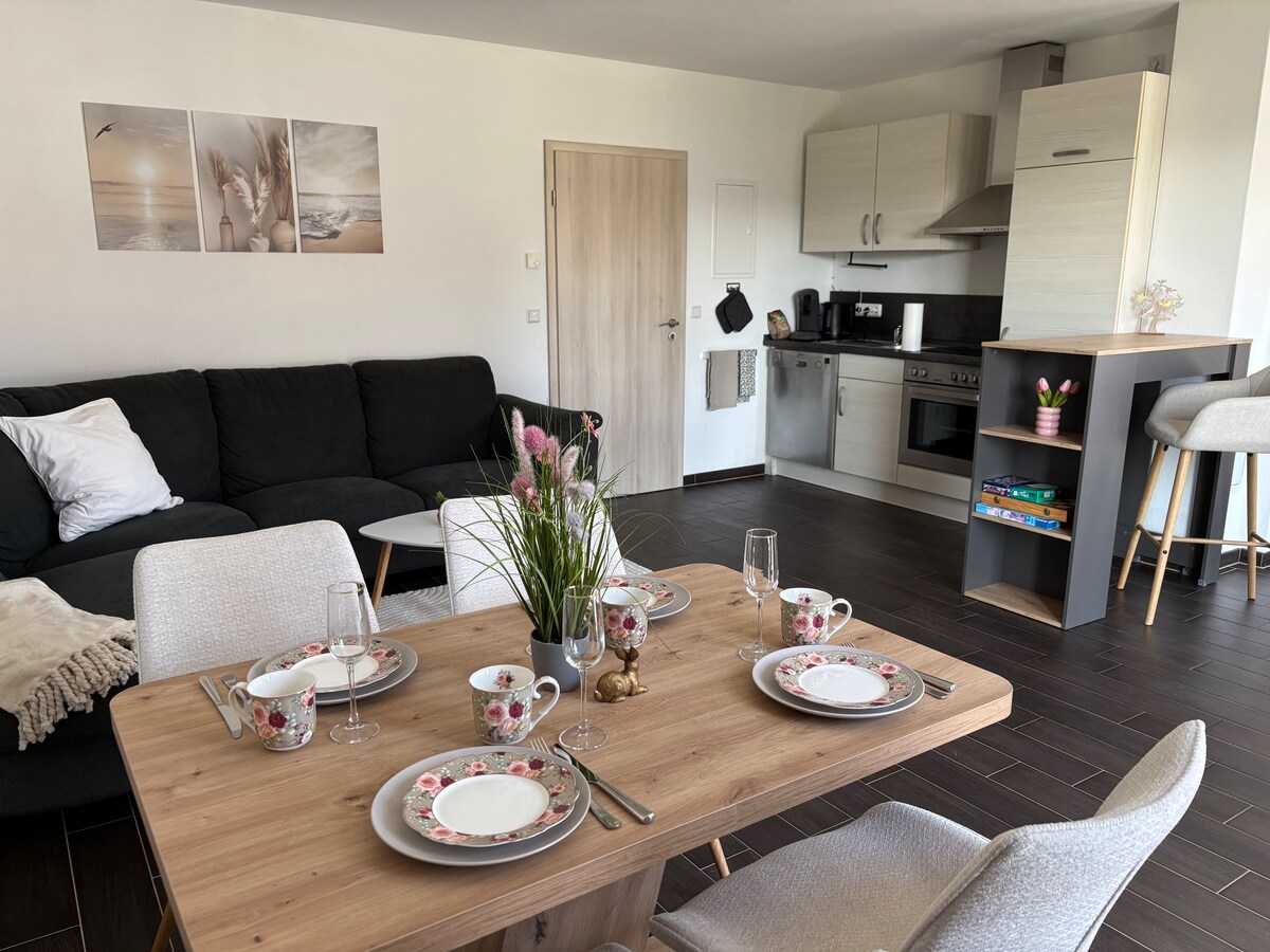 This comfortable 108m² ground-floor apartment (barrier-free) boasts a charming village-like location on the outskirts of town,with easy access to the baroque city of Fulda and the nearby Rhön region. In addition to two bedrooms and a children's room,the apartment features two bathrooms.The spacious living room,equipped with a 55-inch smart TV,open-plan dining area and fully equipped kitchen,is sure to impress.The cozy ambiance of a wood-burning stove and a bathtub invite you to relax and unwind.