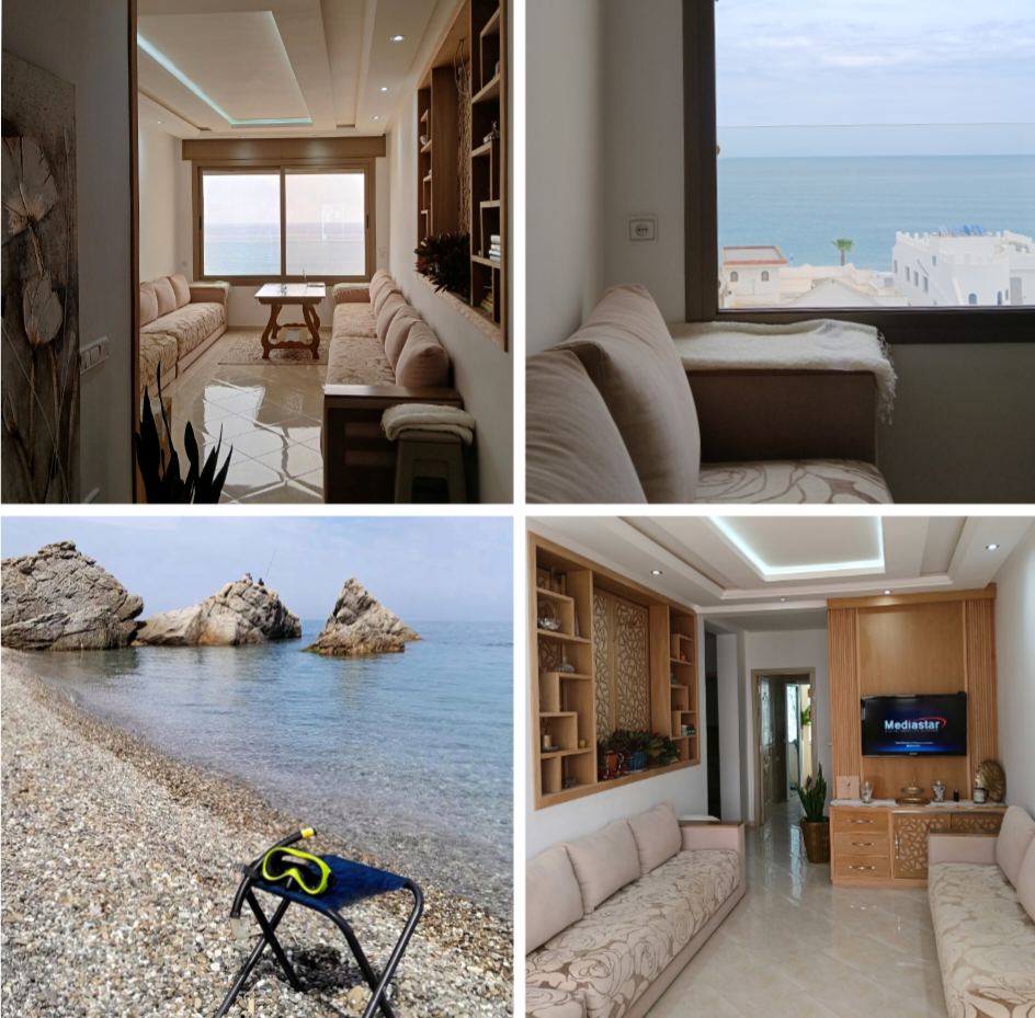 Apartamento de ensueño con vistas al mar y piscina en Cabo Negro, Marruecos. Suite principal, dormitorio infantil, cocina equipada, sala de estar luminosa con TV conectada, comedor para 8 personas. Residencia con 2 grandes piscinas Tobogán, campos de minifútbol, pista de petanca, parque infantil. Acceso rápido a la playa, restaurantes, tiendas, parque acuático, quads, caballos y campo de golf. Aparcamiento y servicio de entrega (Glovo) disponibles. Ideal para unas vacaciones en familia. Atención piscina no operativa en invierno del 1/10 al 15/5