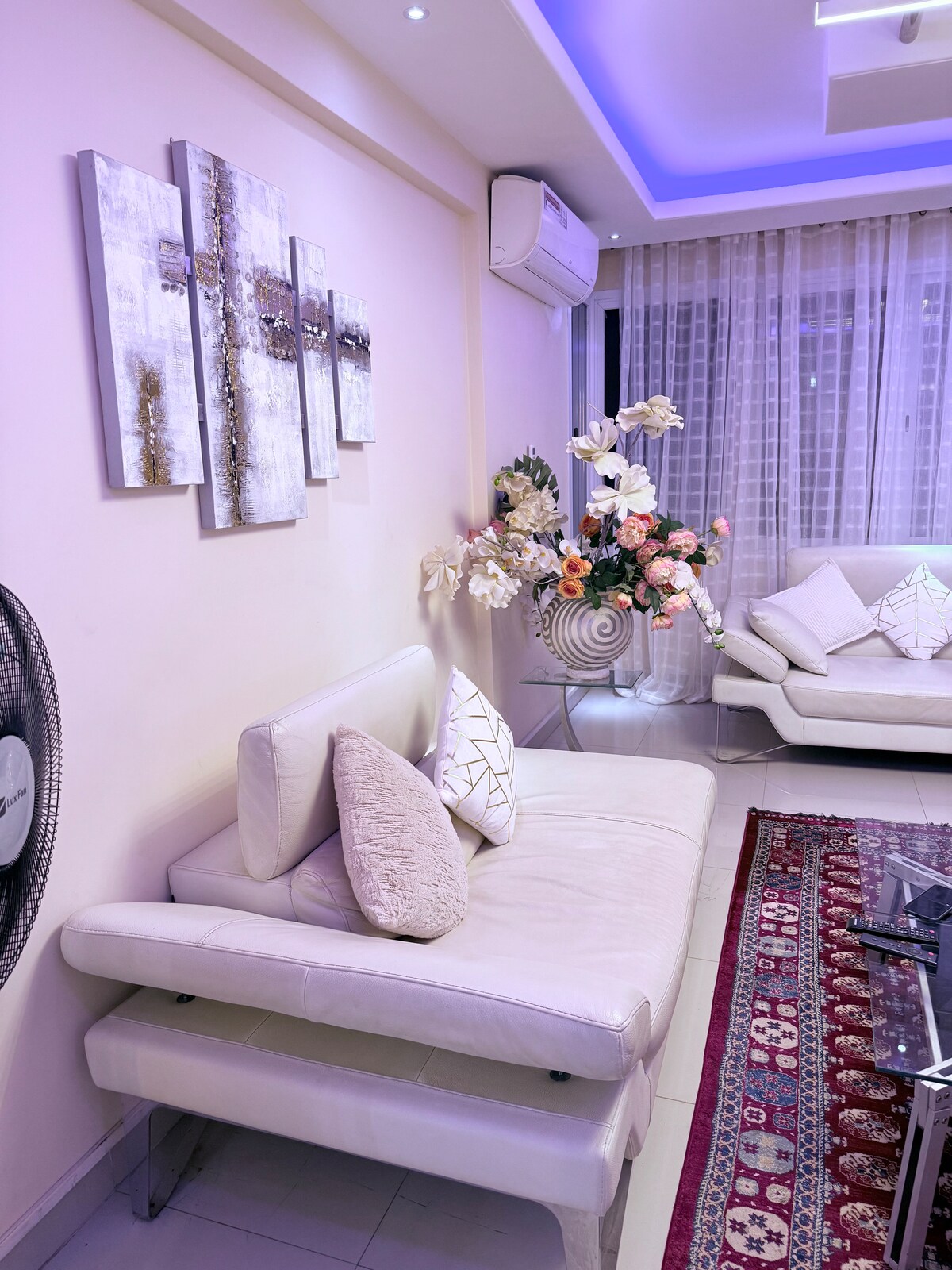 Olvídese de sus preocupaciones en este suntuoso apartamento situado en el cuarto piso con ascensor en una residencia segura. Su impresionante decoración le hará disfrutar de su estancia con total comodidad. El apartamento está totalmente climatizado, equipado con dos amplios salones, Smart TV 4K, fibra óptica, Netflix, Canal, servicio de vigilancia las 24 horas. Se puede poner a su disposición una furgoneta de alquiler para sus traslados al aeropuerto, pero también para sus desplazamientos.