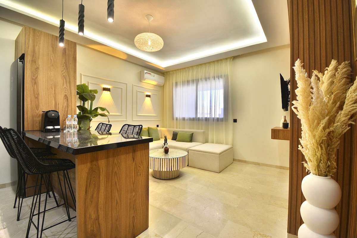Apartamento privado, tranquilo y seguro situado a 7 minutos del aeropuerto, a 12 minutos del desierto de Agafay y a 15 minutos del centro de la ciudad. Disfrute de una terraza beldiya con sala de estar marroquí, estacionamiento gratuito y parada de autobús a 150 m. Barrio muy seguro con seguridad nocturna y cámaras 24/24. Ideal para familias y parejas casadas que buscan comodidad, accesibilidad y autenticidad durante su estadía en Marrakech, con un espacio agradable, luminoso, cálido y perfectamente equipado para su bienestar.