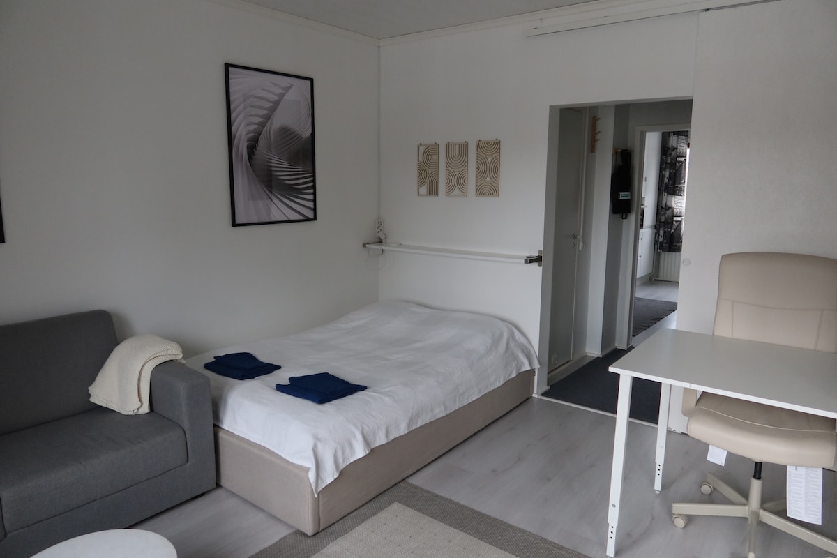 Apartamento de un dormitorio en un edificio de apartamentos nuevo, en una ubicación tranquila y cerca de buenas conexiones de transporte. Cocina con utensilios básicos, dormitorio con cama de matrimonio. Además, se puede pedir una cama supletoria, una cuna y una trona. Fácil acceso desde la autopista y aparcamiento gratuito en el garaje. Tiendas: Lidl a 200 m (punto de carga para coches eléctricos, otro punto de carga en el aparcamiento de Neste a 300 m), S-market a 3 km (abierto las 24 horas) y City-market a 4 km. Se puede llegar al centro de Oulu en autobús (parada a 200 m) o en 10 minutos en coche.
