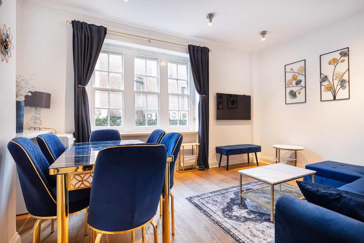 Ubicado en una casa adosada georgiana de grado II cerca de Marble Arch, este encantador apartamento de 1 cama (36 metros cuadrados) combina el encanto histórico con la comodidad moderna. Relájate en un colchón Emma de primera calidad en la cama con dosel de roble o disfruta de una experiencia de cine de 100 pulgadas con proyector láser y sonido Yamaha. Mantente conectado con WiFi de fibra de alta velocidad (120 Mbps). La cocina totalmente equipada, el baño de tejas de piedra y la elegante sala de estar lo convierten en un refugio perfecto. A pocos pasos de Hyde Park, Oxford Street y conexiones de transporte.