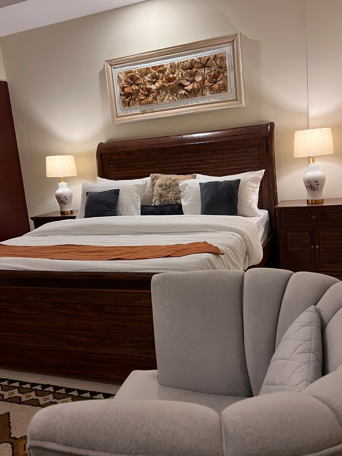 Entra en los apartamentos de 3 dormitorios de Flamingo Grand, los apartamentos con servicio más sofisticados y estéticamente emocionantes de Islamabad. Disfrute de una experiencia segura y con estilo en este lugar céntrico. Tanto si visitas Islamabad por placer como por trabajo, en Flamingo te aseguramos una experiencia de 5 estrellas. Los huéspedes también disfrutan de una plaza de aparcamiento gratuita y segura, wifi gratuito y la experiencia de ver sus series de televisión favoritas en el led inteligente de 65 pulgadas.