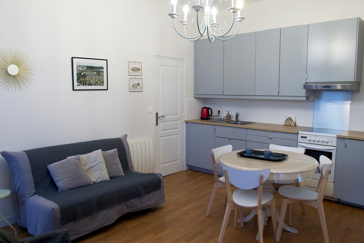 El apartamento se encuentra a los pies del castillo, muy cerca de restaurantes y transporte: a 9 minutos de la estación de Versalles Rive Gauche (tren directo por RER C a París, a 25 minutos de la Torre Eiffel). Apartamento para 2 personas, encontrarás todas las comodidades para visitar y descansar: TV, Netflix, wifi, cocina, cafetera Nespresso, horno, microondas, lavavajillas, sábanas, toallas, paño de cocina...