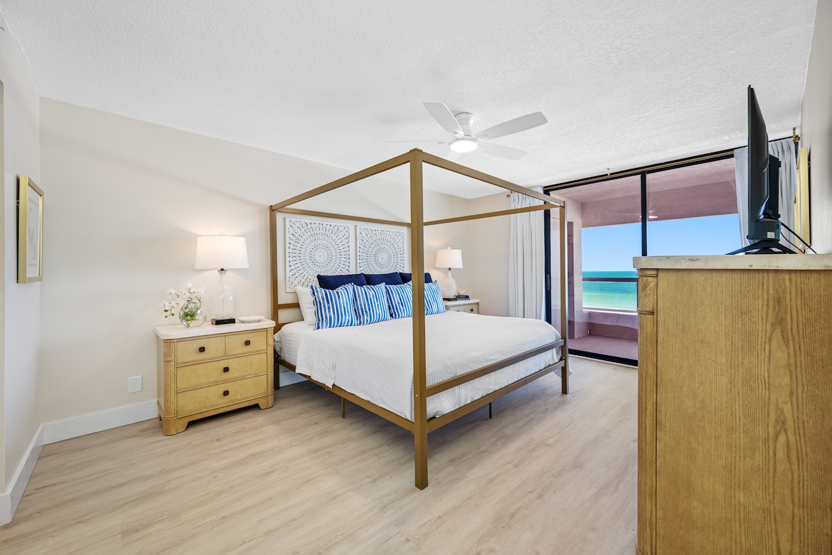 Frente a la playa y hermosas vistas al golfo: TODAS LAS HABITACIONES Se actualizó ★magníficamente. ★- Impresionantes vistas desde el balcón y el interior ★ Acceso privado a la playa. ★ Servicios de hotel: televisores en todas las habitaciones, artículos de tocador, café, pickleball y tenis. ★ Se puede llegar a pie a restaurantes, tiendas y parada de tranvía Equipos de★ playa proporcionados ★ Cocina totalmente equipada y lavandería en la unidad Internet ★ de alta velocidad y espacio de trabajo. ★ Apto para niños y perros ★ Nuevo paisajismo, terraza de la piscina y repavimentación de la cancha.