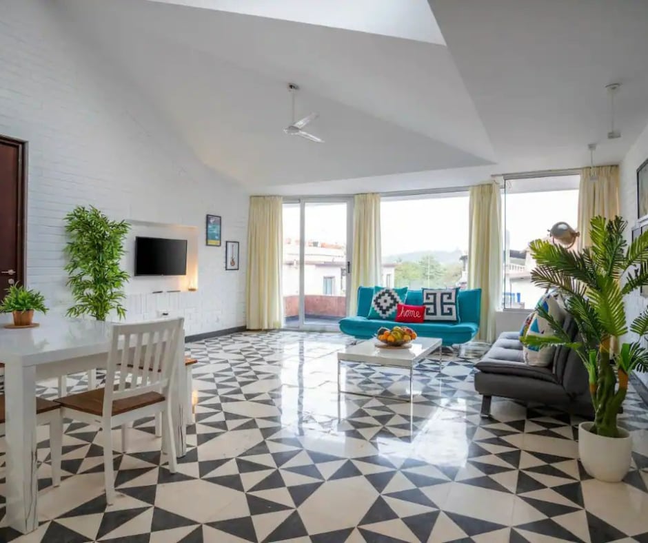 A hidden gem tucked away in Panjim's poshest zip code. Our 2BHK penthouse has a private terrace and is a short walk from Miramar beach. A Goan sanctuary surrounded by greenery; the open-plan, sprawling living room transforms into a chic space after sunset with designer ambient lighting. The famous promenade, grocery stores, and cafes are just a stroll away. Fontainhas & casinos are a short drive away. Enjoy high-speed WiFi if you’re working from home. PS: Look for peacocks in the morning!