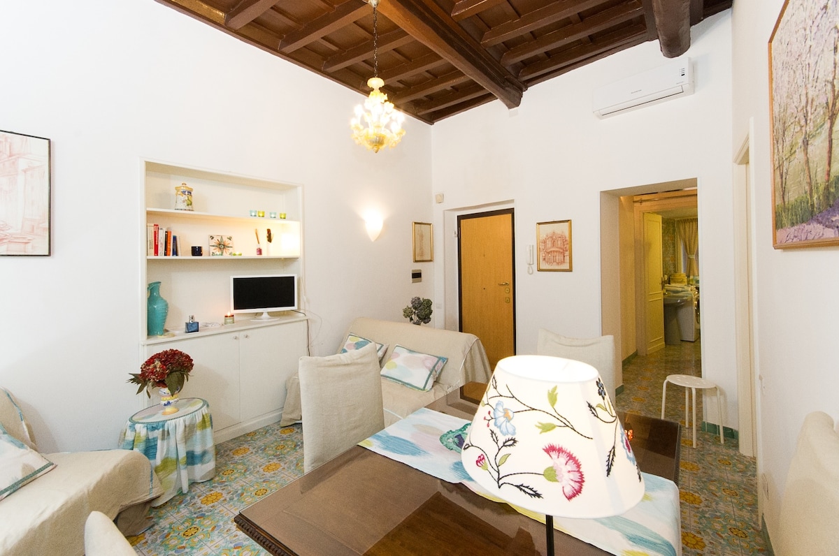 WI-FI free & cozy smart working place. Charming one bedroom apartment of about 50 sqm, located on the corner of Campo de' Fiori and on the second, top floor of an ancient palace of the 15th century, famous for having been for a century the "Inn of the Cow" owned by Vannozza, courtesan and lover of Cardinal Rodrigo Borgia. Strategic location, easy walking distance to reach the most interesting historical and culinary sites of the city center. Finely renovated, fully equipped and comfortable.