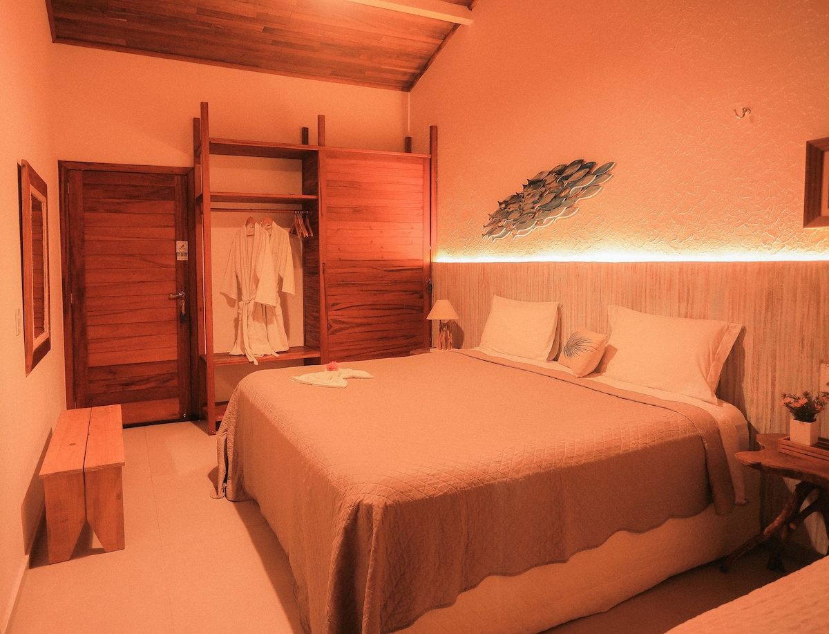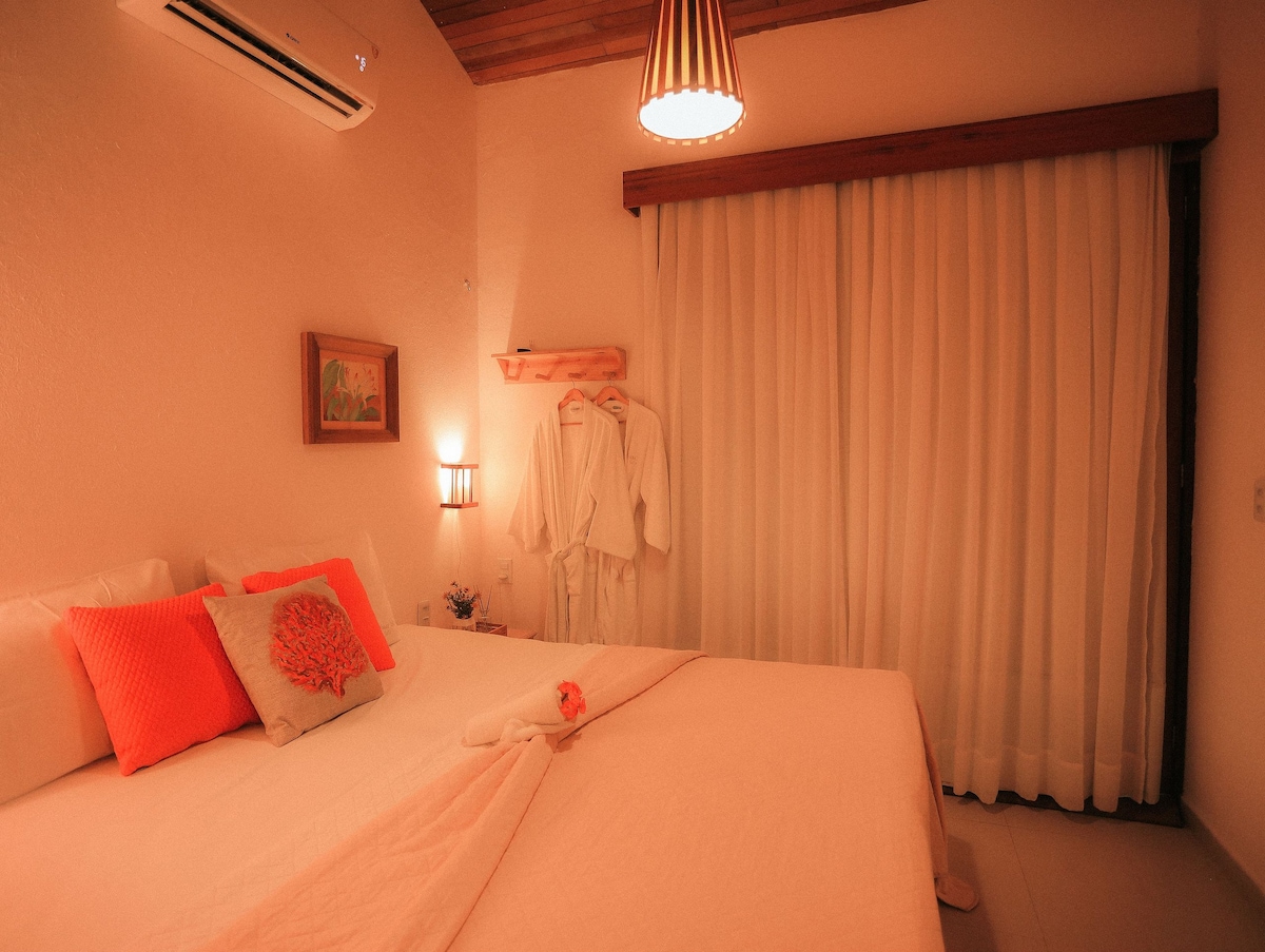 Suíte para 1/2 pessoas, com cama de casal, ar-condicionado, ventilador, banheiro privativo e chuveiro quente. O quarto está localizado no primeiro andar e possui varanda com rede e vista para o jardim da pousada. Ideal para casais ou viajantes que procuram tranquilidade perto da praia.