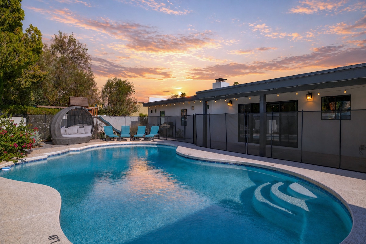 Tu destino final para aventuras en AZ. Moderna villa de lujo a solo 9 minutos en coche del centro de Scottsdale. Relájate en la piscina privada o en el amplio patio trasero con comedor al aire libre, asientos de descanso y parrilla de gas. Crea comidas elaboradas en la cocina gourmet del chef, completa con máquina de café expreso automática totalmente surtida. Todo el grupo se divertirá con la enorme sala de juegos: ¡máquina de pinball con 337 juegos, carreras de coches, futbolín, ping pong, baloncesto y mucho más! A 3,5 millas del centro de Scottsdale.