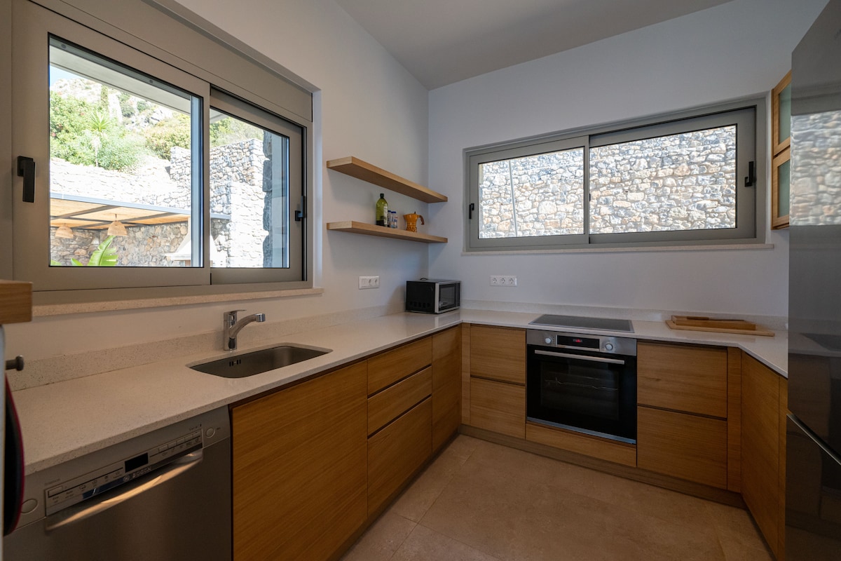 La villa de piedra marina se encuentra justo encima del mar, en un entorno verdaderamente único que ofrece vistas panorámicas ininterrumpidas del interminable azul. Una escalera privada de la casa conduce directamente a una playa pequeña y tranquila, lo que te brinda un acceso fácil y exclusivo al mar cuando lo desees. El sonido relajante de las olas y la sensación de estar a solo unos pasos del agua crean el ambiente perfecto para una relajación completa.