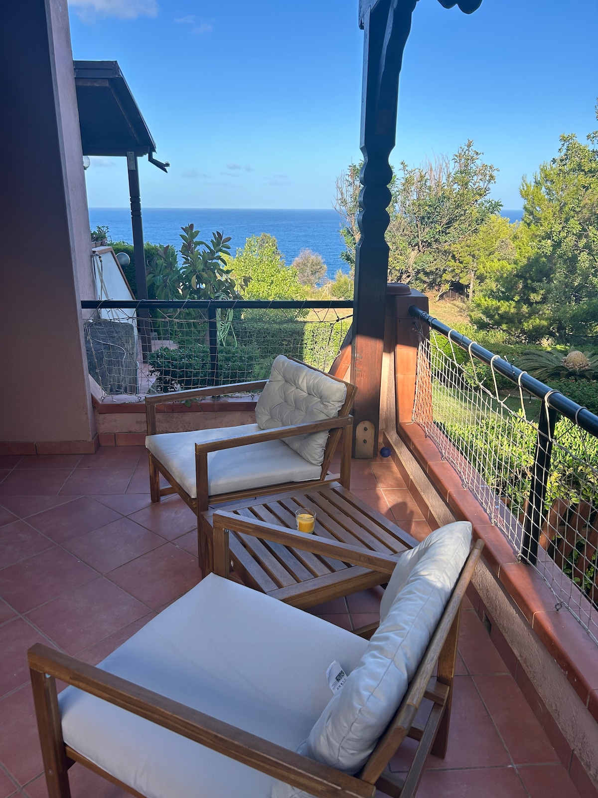 Villa sul mare con accesso diretto alla spiaggia. A metà strada tra Diamante e Belvedere. Situata all'interno di un parco privato chiamato"Lo Zodiaco". Disposta su 2 livelli: al piano terra bagno di servizio con lavatrice, cucina e soggiorno con divano tv. Al piano superiore bagno con doccia ampia e 3 camere da letto.Complessivamente può ospitare 7 persone. Area esterna: ampio patio per pranzare all'esterno con tavolo e barbecue, giardino con dondolo/sdraio e scaletta per scendere in spiaggia