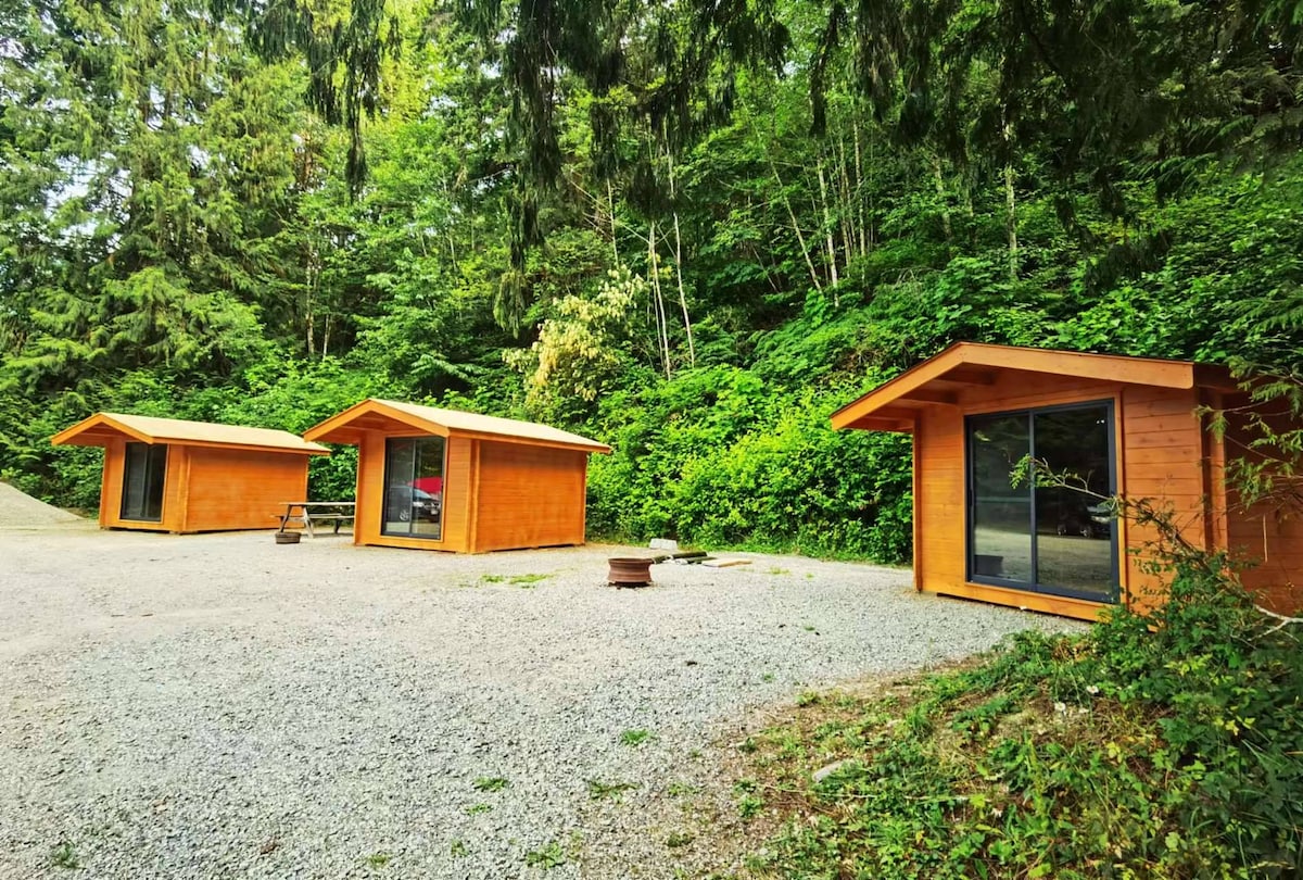 Nuestra acogedora cabaña de huéspedes está enclavada en el bosque, a cinco minutos a pie de la playa y cerca de rutas de ciclismo de montaña. ¡Cena al aire libre en el gran patio! Acceso al jacuzzi al aire libre. Se proporcionan albornoces de felpa. Cocina bien equipada que incluye nevera de tamaño completo, horno de convección, placa eléctrica, microondas, molinillo, cafetera y barbacoa de propano al aire libre. Ducha cubierta. Inodoro de compostaje ecológico Sun-Mar en un edificio separado. Hay un monitor montado en la pared (sin cable) para conectar tus dispositivos.