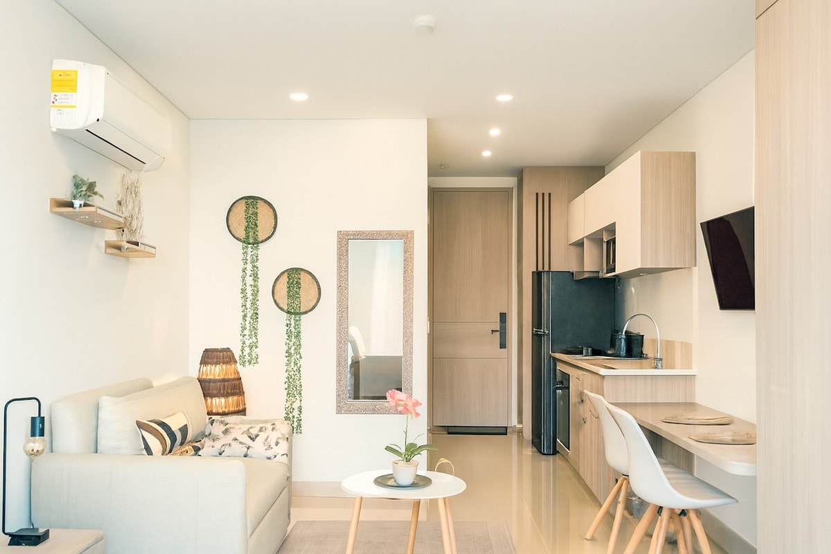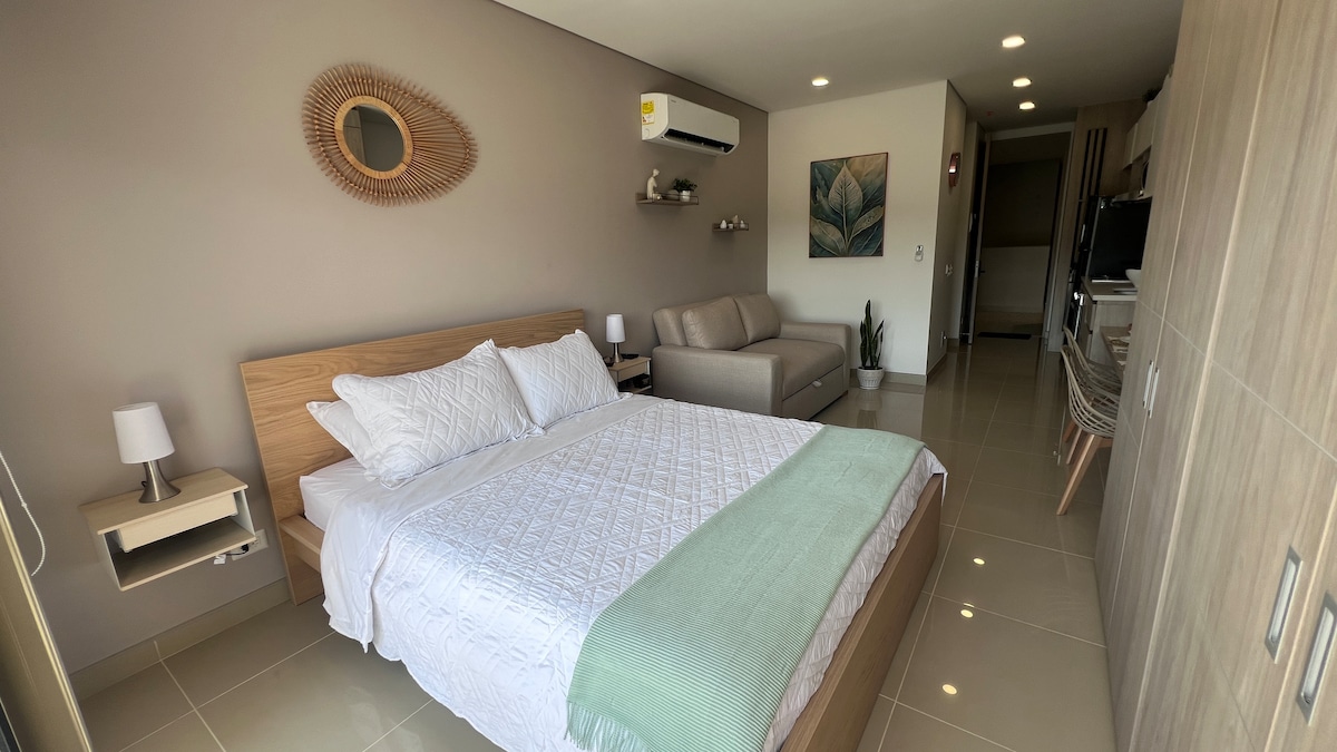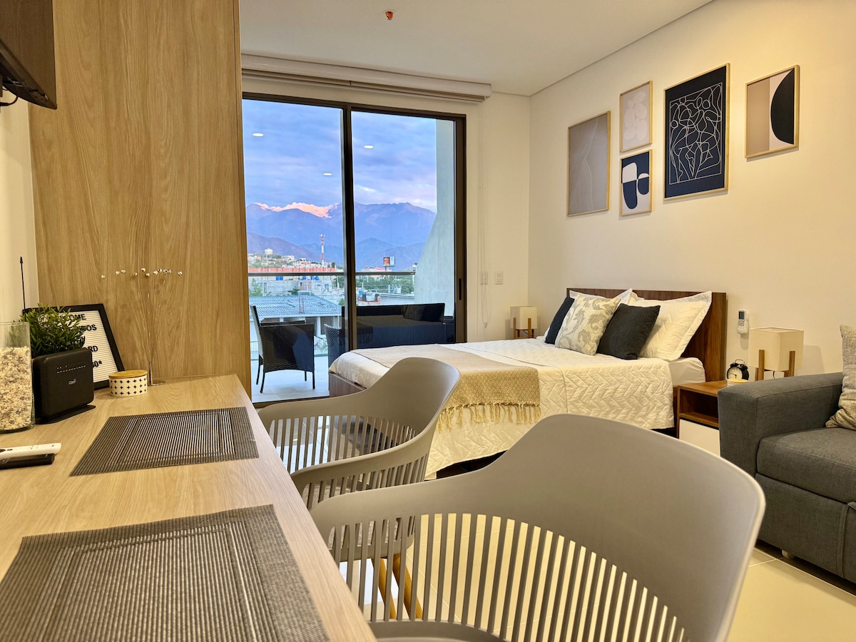 Despierta con vista a la ciudad y al mar desde el balcón en esta apartasuite ideal para 3 personas. Un espacio moderno y cómodo para descansar, vacacionar o trabajar remoto, con wifi de fibra óptica, Smart TV y cocina totalmente equipada. Vive una experiencia tipo resort con piscinas, jacuzzi panorámico, spa, gimnasio, coworking, BBQ y restaurante en la terraza. Ubicada en Rodadero Sur, a pasos de la playa y rodeada de excelentes restaurantes.
