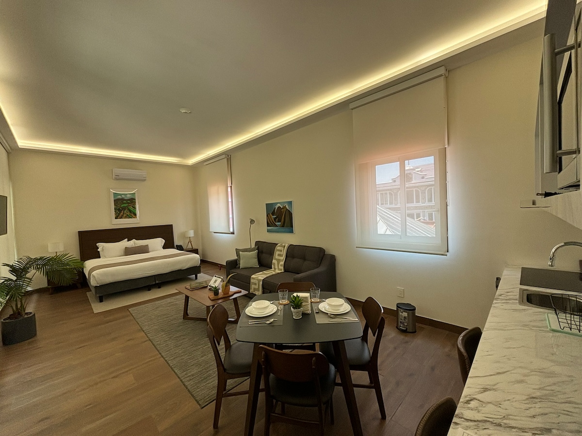 Este apartahotel lleno de estilo está cerca de la magnífica zona del Angel de la Independencia. El ESTUDIO consta de 55 m2 con 1 cama king size, escritorio de trabajo, tv de 55 pulgadas, baño con regadera, sala (convertible a cama matrimonial), cocineta semi-equipada (refrigerador, microondas, cafetera, tostador y tarja) y balcón. Nuestro wifi simétrico es de más de 100 MB. El edificio ofrece una terraza con bar, jacuzzi, camastros, mesas y alimentos. Estacionamiento sujeto a disponibilidad.