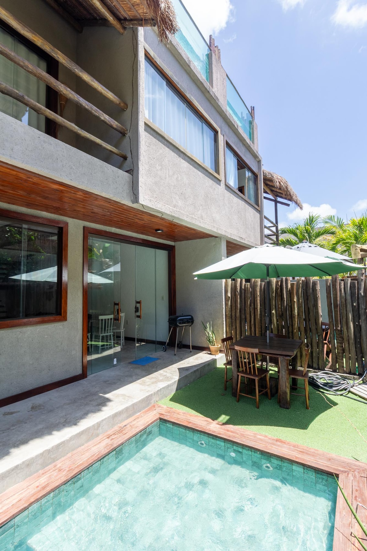 Venga a descansar con su familia en espacios cómodos, lugar súper tranquilo y agradable, excelente ubicación, disponemos de un bungalow suite con piscina privada. Detalles: Aparcamiento propio, wifi, ducha climatizada, secador, cocina (cafetera, sandwichera, microondas y minibar), plancha, cama queen y una cama individual. Disponemos de una nevera y dos sillas de playa. A 800 metros de Praia do Riacho, cerca de la Capilla de los Milagros y restaurantes de renombre.