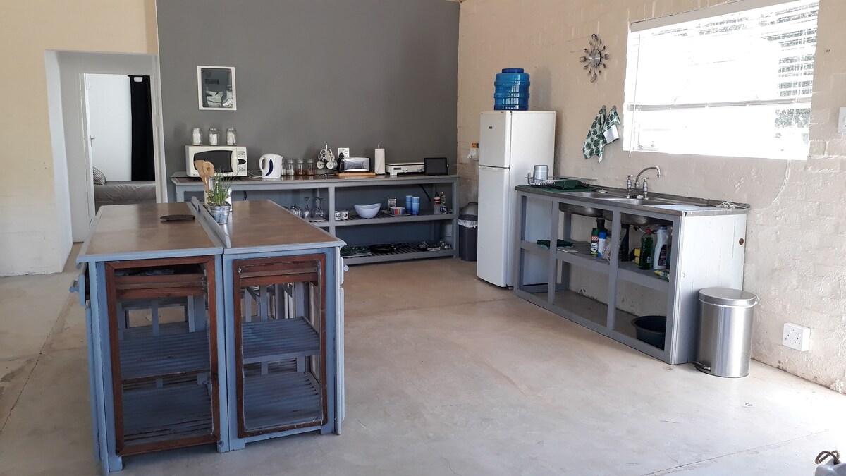 Ed's Place es una encantadora casa de campo independiente con tres dormitorios con baño, cada uno con una cama tamaño king. La sala de estar incluye una cómoda sala de estar con TV, una gran mesa de comedor y una cocina bien equipada. Los muebles de buen gusto dan una sensación de comodidad rústica de granja. La pintoresca casa de campo con tejado de paja, situada en una cresta alta en la granja de caza de Kaba, ofrece una vista única y espectacular sobre las praderas onduladas, el bosque costero, el vasto campo de dunas de Alejandría y el océano.