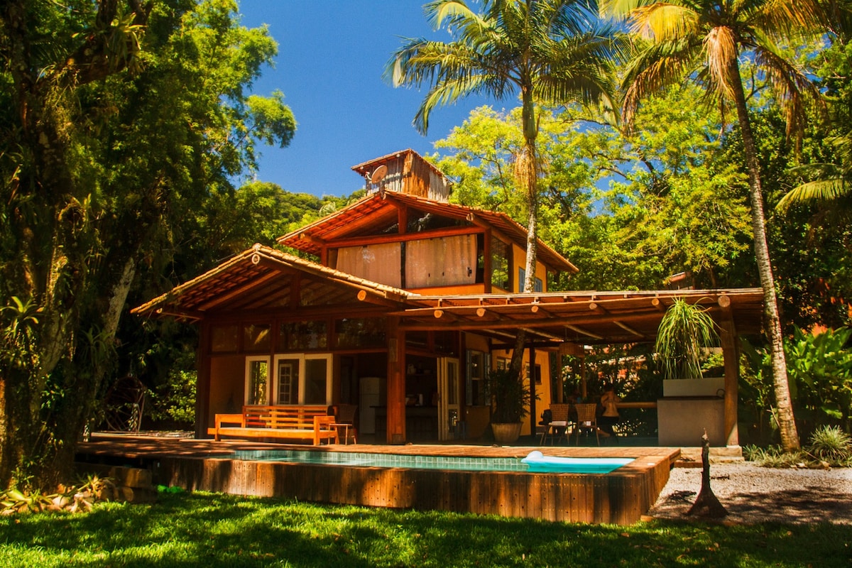Hermosa casa en condominio sin muros internos, lo que da la sensación de un gran jardín. Wi-Fi de alta velocidad (250 Mbps). A sólo 600 metros de la playa de Paúba, con acceso peatonal desde la parte trasera del condominio, esta ubicación privilegiada se encuentra entre las colinas de la mata atlántica y el mar. Muy cerca (2 km) se encuentra la popular playa de Maresias, un lugar para practicar surf y la hermosa multitud en la costa norte de São Paulo.