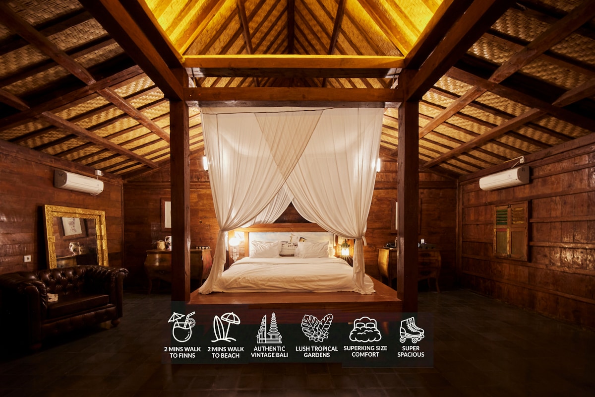 Huge Authentic Balinese wooden house on top of a brick castle. A rare find in Bali, offering spaciousness, charm, & privacy. Lush gardens minutes from Berawa Surf Beach, Finns & Atlas Clubs & Restaurants. King size bedroom/lounge with ensuite, balcony, and TV, perfect for work or leisure. Downstairs, a shared kitchen, dining, and lounge area. Sprawling gardens over 500 sqm and a 10-meter pool. Other Spaces airbnb.ca/h/Joglo1 airbnb.ca/h/joglo2 airbnb.ca/h/duajoglos airbnb.ca/h/wholevilla