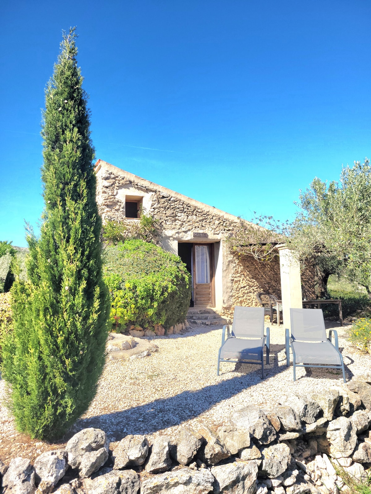 Una casa de piedra muy privada y acogedora con impresionantes vistas a la montaña y a la piscina. PERFECTO SI TE GUSTA EL SILENCIO Y LA NATURALEZA. La zona cuenta con un río, castillo, bodega, montañas y playas mediterráneas. Este precioso estudio tiene todo lo que necesitas para disfrutar de unas vacaciones relajantes. La terraza privada exterior tiene una barbacoa, mesa, sillas y vistas increíbles para disfrutar de una copa de vino por la noche. La Cocina esta totalmente equipada Solo compartirás la zona de la piscina con otros huéspedes. El wifi es excelente el 90 % de las veces.