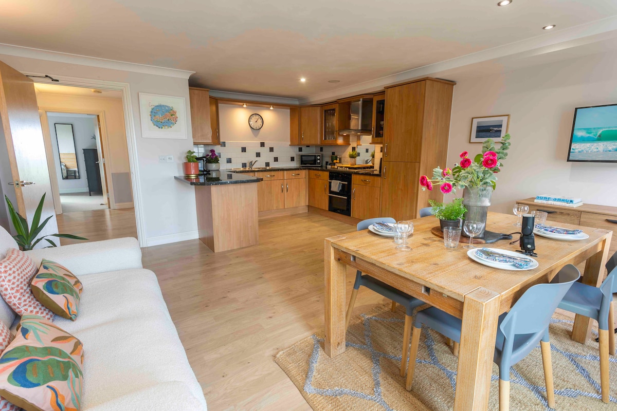 Excelente ubicación en el extremo sur de la famosa playa de Fistral. El centro de Newquay está a 20 minutos caminando y cuenta con una amplia variedad de bares y restaurantes. El apartamento incluye un balcón privado con vistas a la playa para atardeceres y mañanas luminosas. Los hoteles a ambos lados del departamento ofrecen restaurantes elegantes y una furgoneta de café se estaciona justo afuera en verano. Perfecto para caminar, relajarse o surfear. Tu reservación incluye un lugar de estacionamiento en el lugar. Se permiten 2 mascotas por estancia.