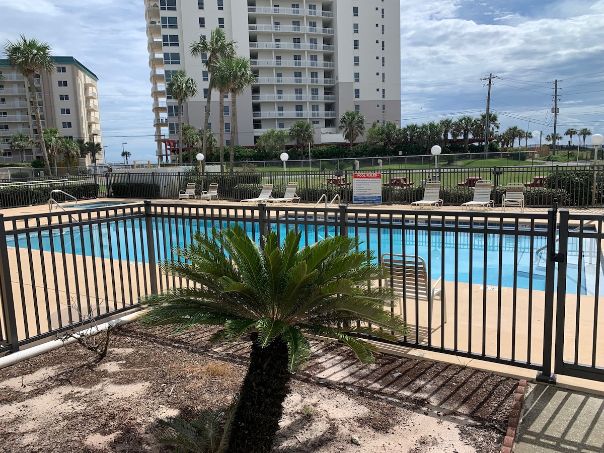 Hermoso apartamento de 1 dormitorio/1 baño frente al golfo directamente en la playa. Amplio balcón con vistas al golfo (4 sillas). Cama tamaño queen en el dormitorio y bañera de hidromasaje en el baño. Colchón hinchable tamaño queen que cabe en la sala de estar para huéspedes adicionales. El nombre del apartamento es SeaSpray Condominiums (Edificio Oeste). Se encuentra a solo 2 millas al este del mundialmente famoso Flora Bama Lounge. Tendrás acceso a servicios en los 3 edificios del complejo. La vista desde el balcón es increíble y estarás a pocos pasos de la playa.