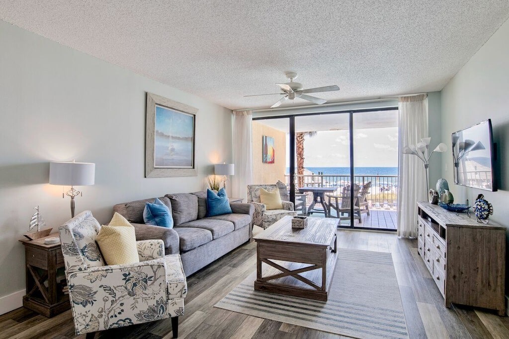 **Recently Updated Interior!** Experience the stunning Gulf of America from the comfort of this beachfront 2-King bedroom, 2-bath condo located directly on Pensacola Beach, named America’s Best Beach by the Condé Nast Traveler Readers’ Choice Awards! This beach condo boasts a vibrant interior filled with beach-themed accents, a private balcony with sweeping ocean views, and access to 2 pools (1 heated) and a hot tub. Enjoy the best restaurants and shopping on the beach, all within a short walk.