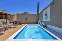 La propiedad se divide en 2 casas independientes. Un alojamiento tiene capacidad para los huéspedes y el otro de fondo reside en los propietarios/anfitriones. La casa de huéspedes tiene una piscina climatizada exclusiva, espacio gourmet con parrilla, baño, nevera, cervecería, horno de leña, estufa y freidora de aire. Ofrece 2 suites con cama doble, sala de TV con sofá cama y comedor. Aire acondicionado en las 2 suites y sala de TV. Tiene espacio para la oficina en casa con un sofá cama y ventilador. Garaje cubierto para 2 autos