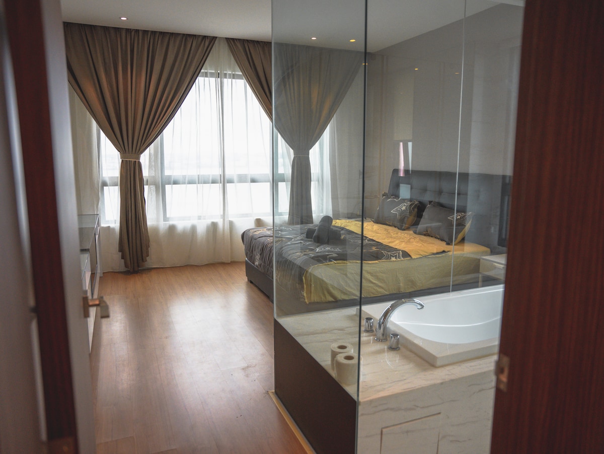 This is a spacious 2Bedroom unit perfectly fit for guests up to 5 pax with total of 1 king size bed 1 queen size bed 1 single bed High floor with high view. 1. Basketball Court 1. Gym Room 2. Function Hall 3. Lounge 4. Library 5. Manicure Shop 6. Mini Theatre 7. BBQ Deck 8. Swimming Pool 9. Sauna 10. Jacuzzi 11. Game room (Pool Table, PS Room, Darts and more) 12. Laundry 13. Mini Market -Sky Garden Guest are not allow to smoke in the room , please smoke at the balcony if needed