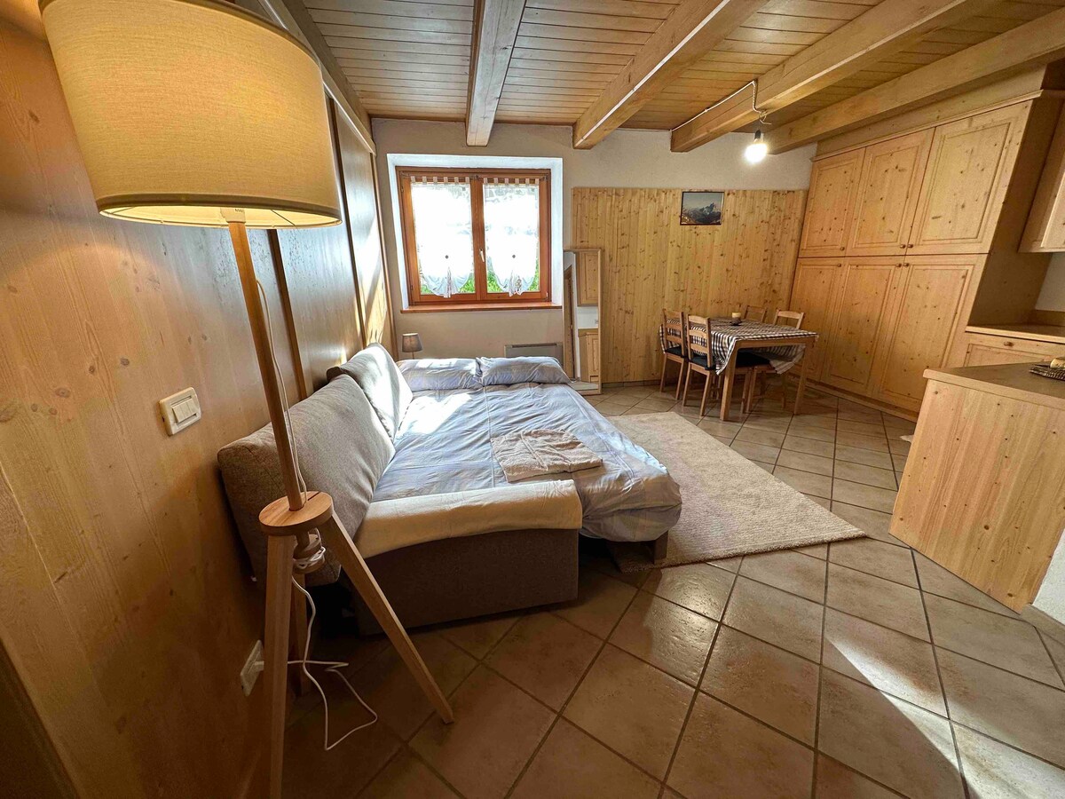 Il monolocale, interamente in legno di un tempo, è ampio 37,50 mq e rappresenta la parte più antica della casa che risale alla fine dell'800. Un unico locale ospita l'angolo notte e la zona giorno con angolo cucina da cui una porta-finestra conduce all'esterno: qui, seduti ad ammirare il panorama facendo colazione o bevendo un aperitivo, si possono abitualmente vedere cervi e caprioli che pascolano nell'ampio prato sottostante. A completare l'appartamento vi è il bagno con finestra.