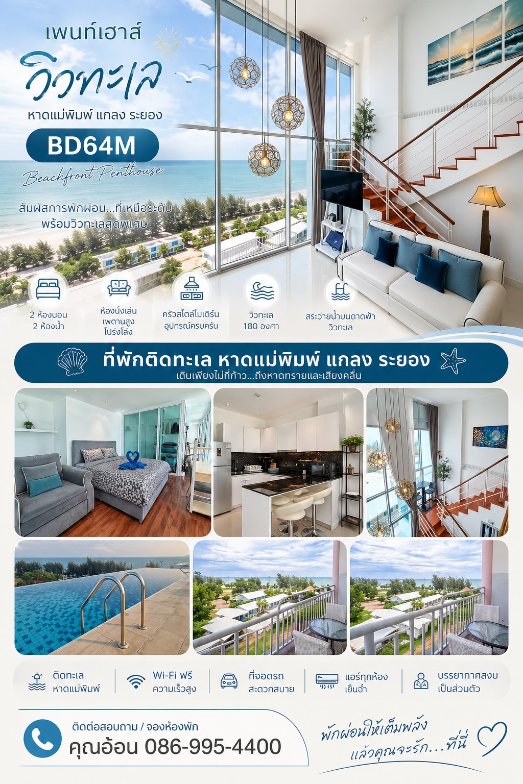 Unidad de condominio de 75 metros cuadrados recientemente renovada en el piso 20 con vistas completas al mar de la playa Mae Ram Phueng. La unidad viene con 1 dormitorio, 1 baño, sala de estar y área de cocina. Puede alojar hasta 4 adultos. Las comodidades incluyen dos camas individuales (se pueden convertir en una cama extragrande), un sofá cama, televisor LED de pantalla grande, mesa de comedor, área de cocina, lavadora e Internet de alta velocidad.