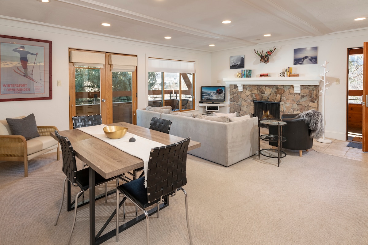Hicimos una remodelación completa de arriba a abajo de nuestra casa adosada de 2 pisos llena de luz, grande y acogedora con 4 dormitorios y 3 baños, todo con suelo radiante. La gran sala con vistas al río es perfecta para relajarse o entretenerse después de un día en la montaña: verano o invierno. ¡La piscina y dos jacuzzis solo se suman a la diversión! Estamos a solo 1,5 cuadras del mercado de la ciudad y del centro de Aspen. ¡No necesitas un auto, pero tenemos estacionamiento si tienes uno ! No tenemos aire acondicionado.
