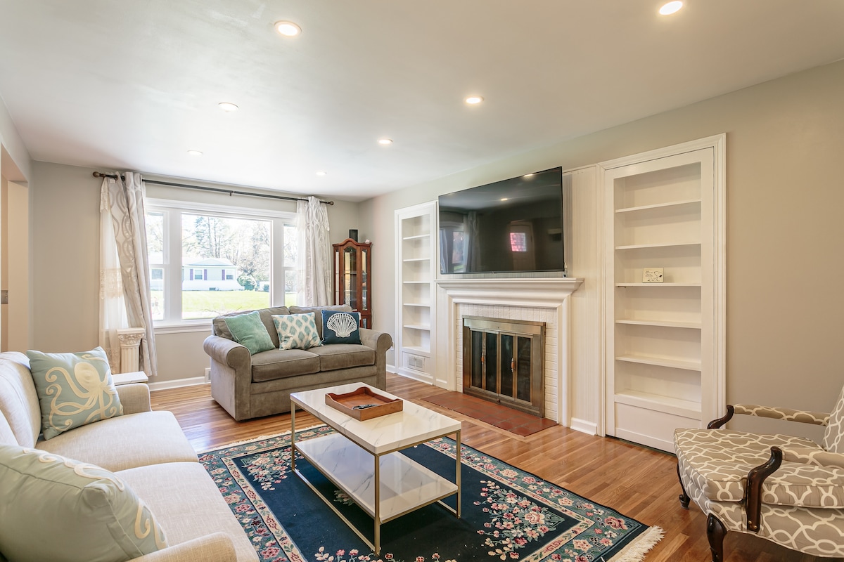 Casa recién reformada en el corazón de Pittsford. ¡3 dormitorios y sofá cama! Cada dormitorio tiene baño completo, TV y ventilador de techo. Lavandería en el primer piso y 1/2 baño. Wifi. Electrodomésticos nuevos. Larga entrada con estacionamiento para 6 coches, autocaravanas o incluso camiones de 18 ruedas. Agua embotellada, café y té regulares/descafeinados incluidos. Senda para caminar/montar en bicicleta al otro lado de la calle. A 5 minutos en coche del pueblo de Pittsford, Bushnell's Basin, East View Mall, universidades (Nazareth y St. John Fisher), campos de golf, tienda de comestibles Wegmans, plazas comerciales y restaurantes.