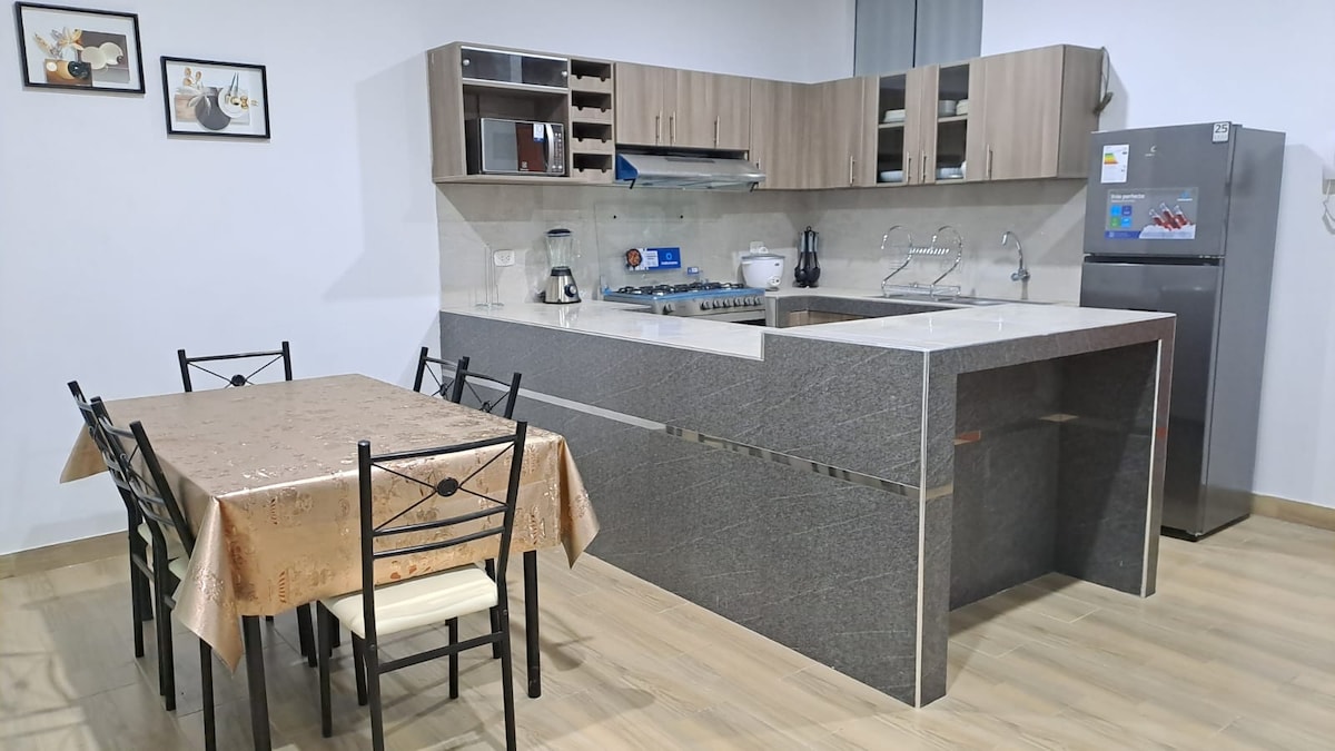 ¡Bienvenido a tu hogar en Piura ! Departamento de estreno ideal para tus días de estancia . Te brindamos un ambiente cálido y acogedor desde el primer momento . El lugar es tranquilo y seguro , se encuentra ubicado cerca de la UCV , Super mercados Tottus y maestro ace Home center y a 8 min del Real plaza. Cuenta con : - 02 dormitorios con cama de plaza y media y un dormitorio con una cama de 2 plazas - Cocina moderna - Sala Equipada con tv 75 " -01 baño con agua caliente -3 ventiladores
