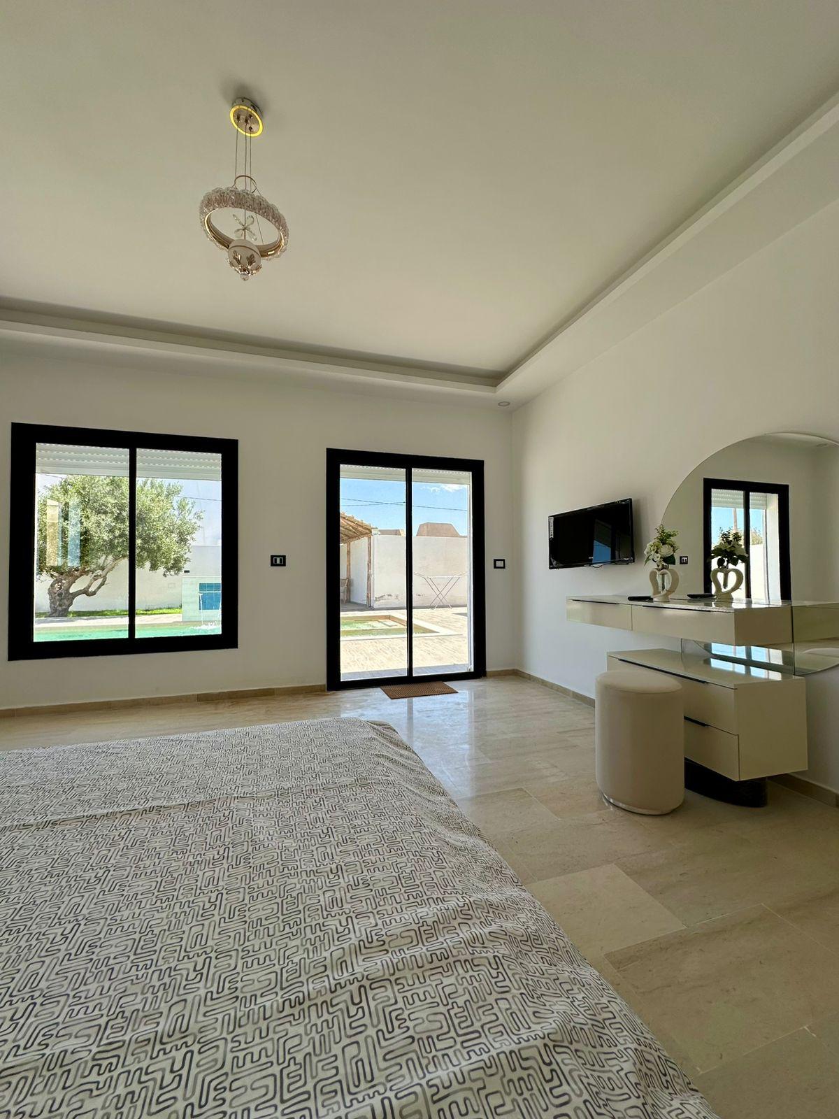 Villa con piscina privada sin vecinos 🏝️ en Djerba Midoun. 3 elegantes dormitorios🛏️, una suite con cama king size y TV📺. Cocina totalmente equipada 🍷 (horno, microondas, vajilla, lavadora🧼), aire acondicionado❄️, wifi📶, ropa de cama incluida🧺. Exterior cuidado con tumbonas ☀️ y muebles de jardín🌴. A 5 minutos en auto de la playa🏖️, zona turística🎯, a 25 minutos del aeropuerto✈️. Cuna 👶