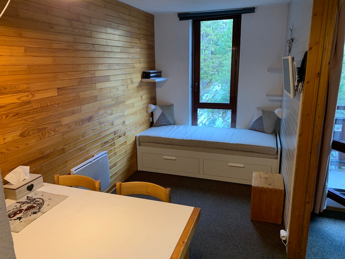 Estudio en Plagne Bellecôte (2+2) - Acceso a las pistas de esquí. Para 2 personas + posibilidad de estudio contiguo para 2 personas. Estudio de 11 m² para 2 personas en el primer piso de la residencia 3000. Cocina: Cocina pequeña en la entrada con 2 placas de cerámica, nevera, microondas mixto, cafetera y hervidor. Sala de estar: 1 cama individual (90 cm) y 1 cama nido (90 cm) Televisor de pantalla plana. Baño: ducha e inodoro Taquilla de esquí frente al Sport 2000