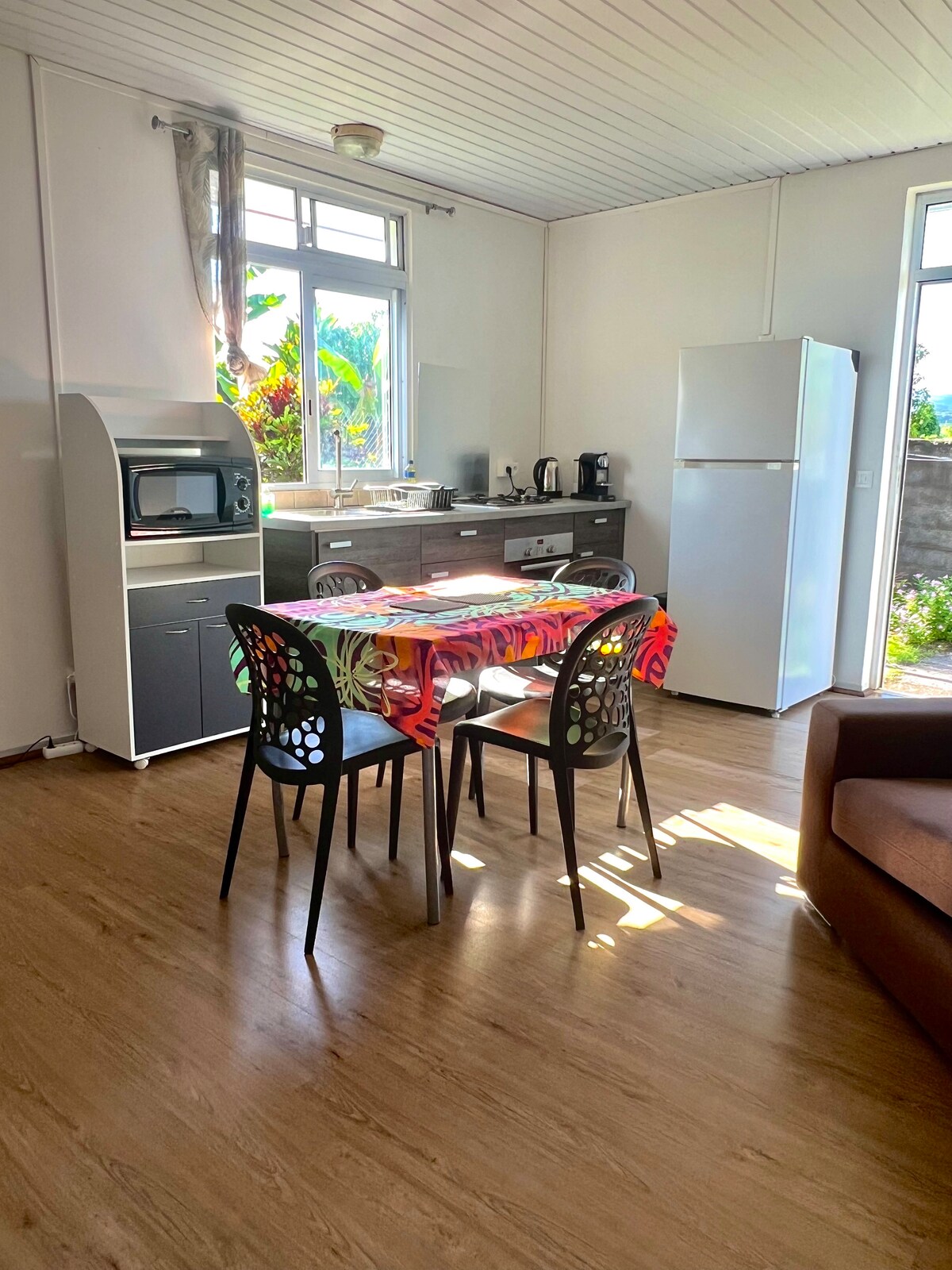 Iaorana En una playa de arena negra frente al gran paso de Vairao, nuestro bungalow te da la bienvenida a un entorno auténtico, amable y tranquilo para que lo disfrutes al máximo. Desde tu bungalow, emprende una aventura en el mar: kayak, esnórquel, surf, todo lo que necesitas para explorar el océano. Nos encanta compartir nuestra cultura, platos tradicionales, historias y forma de vida. Las instalaciones del baño están separadas en un espacio independiente, con todas las comodidades que necesitas. ¡Esperamos recibirte! 🌺