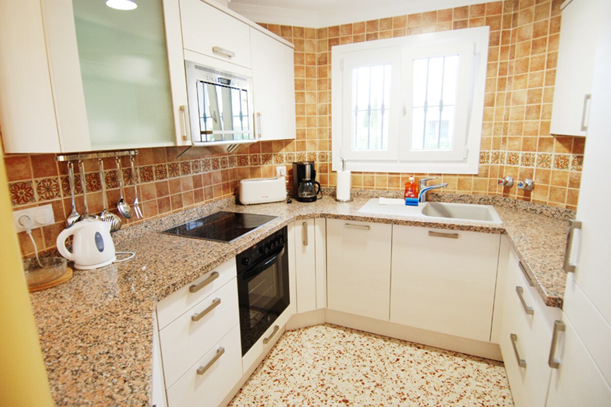 Comfortable y perfecta por su ubicacion casa esta a tan solo 350 m de la larga y bonita playa de arena fina. Tiene 3 dormitorios, 2 baños, un amplio salon abierto con sofa-cama, comedor y cocina. Se sentiran comodos 6 personas (+2 como max)