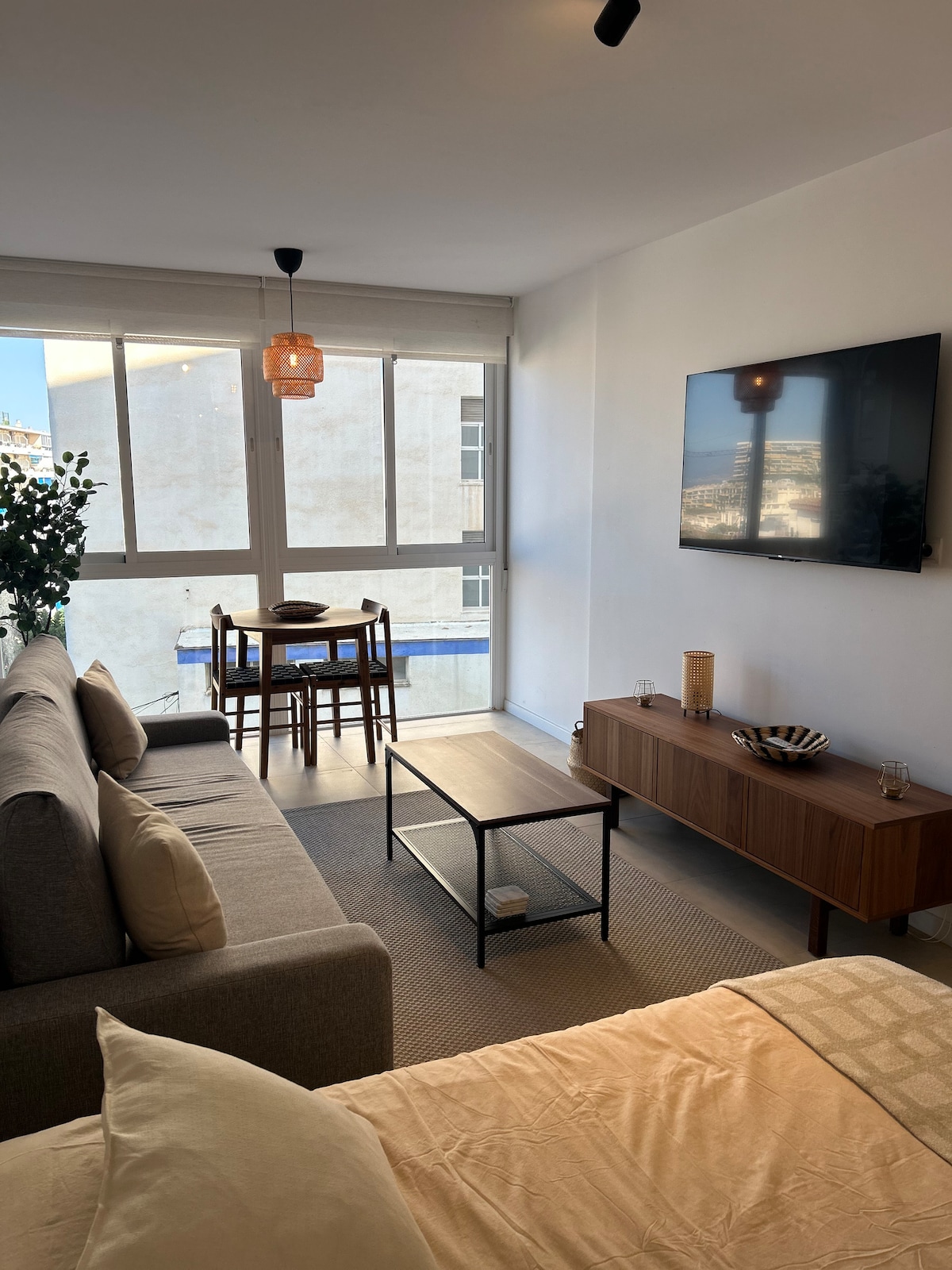 Este hermoso alojamiento está recién reformado, le hemos dado un toque personal y mucho cariño. Está situado a 200m de la playa, cerca de buenos restaurantes, chiringuitos, parada de autobús al frente y cerca del tren. Tiene wifi, aire acondicionado y un ventanal que se abre, quedando una terraza para que puedas disfrutar de una maravillosa vista del mar. El edificio es tranquilo, familiar, con espacios verdes. Ideal para desconectar o seguir conectado teletrabajando.