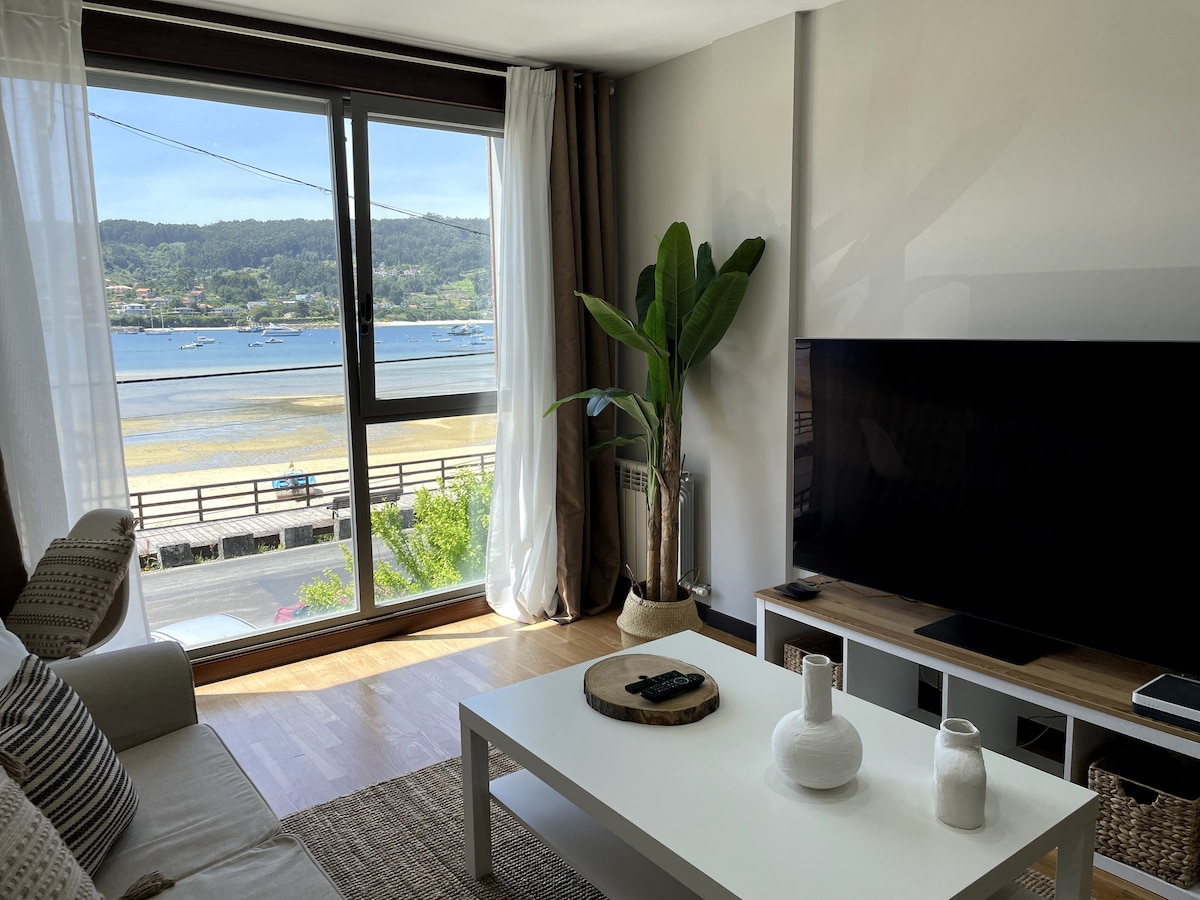 Moderno y acogedor alojamiento situado en primera línea de la playa de Aldán. El lugar perfecto para tus vacaciones!! Aquí encontrarás mar, montaña, sol, gastronomía, ocio, etc. Situado en un moderno y reciente edificio al pie del paseo marítimo, este alojamiento se distribuye en dormitorio, baño completo, salón con cocina americana y plaza de garaje. Si bien el edificio está localizado en el paseo marítimo, no dispone de vistas directas al mar.