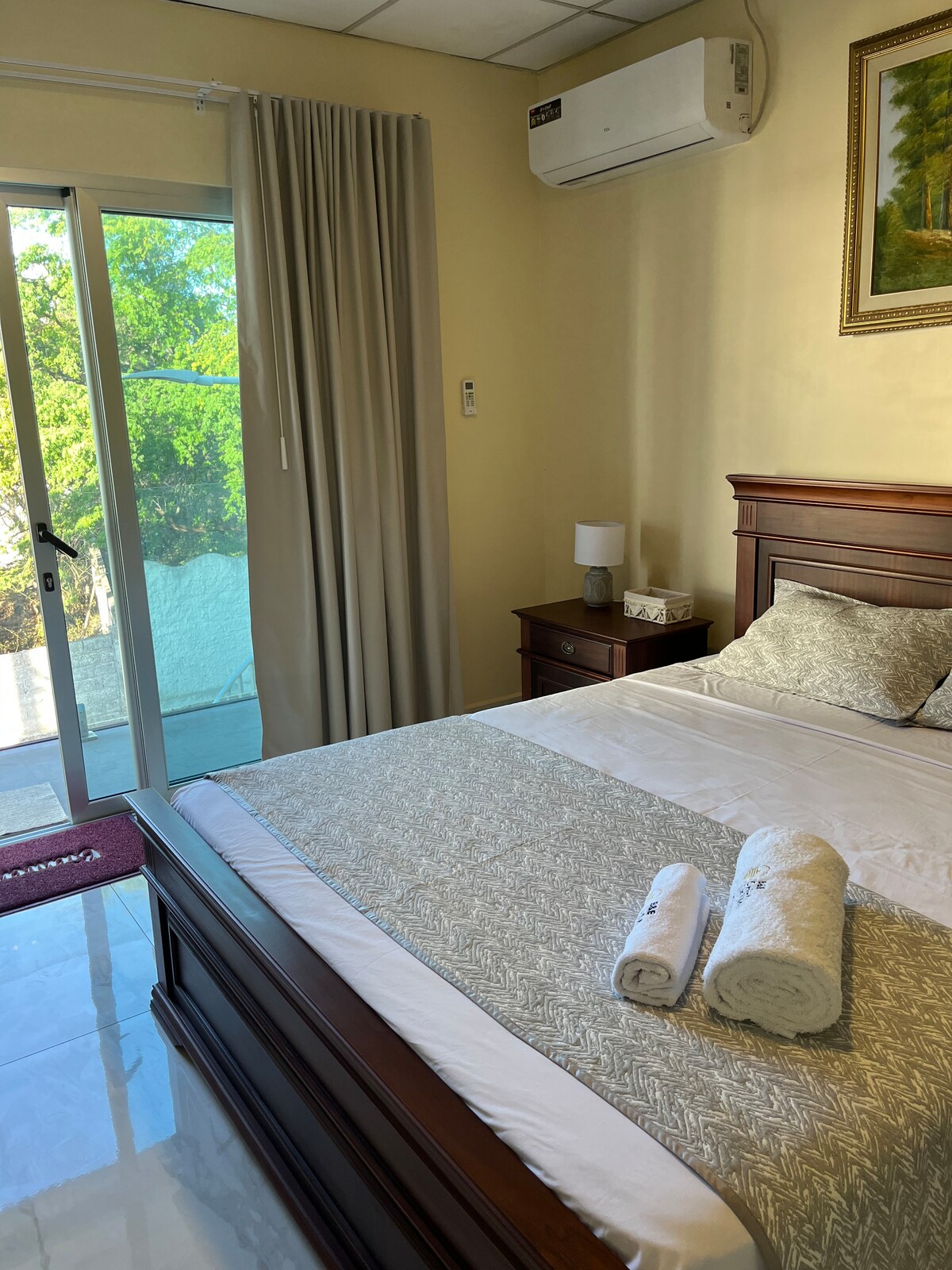 Esta ubicado a menos de 100 mts de la playa Man, el apartamento cuenta con una cómoda cama King, acceso al balcón propio con vista al mar, dispone de cortinas blackout, aire acondicionado y smart tv de 32'' con Netflix, en su refrigerador tendrás una botella de agua de cortesía por estadía, adicional a una cafetera para degustarte con un café molido de aroma, el baño privado con agua caliente, se brinda toallas y dispensador de jabón y shampoo..