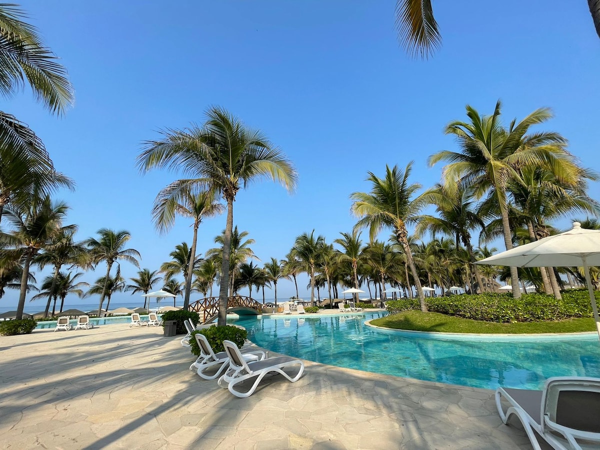 Disfruta de lujo y comodidad en este depto con vista parcial al mar en el 9º piso y acceso a playa privada. Tendrás acceso a: ✅ Playa privada con toldos y servicio de snacks y bebidas 🏖️🌊☀️ 🍹🧉🍺 ✅ 8 albercas, una con toboganes 🏊 ✅ Gym, 🏋️ ✅ Cine, 🎦🍿 ✅ SPA, 🧖♀️ ✅ Cancha de tenis y pádel, 🎾 ✅ Billar, 🎱 ✅ Futbolito, ✅ Voleibol y 🏐 ✅ Ludoteca Disfruta de unas vacaciones únicas en un espacio que combina lujo y entretenimiento