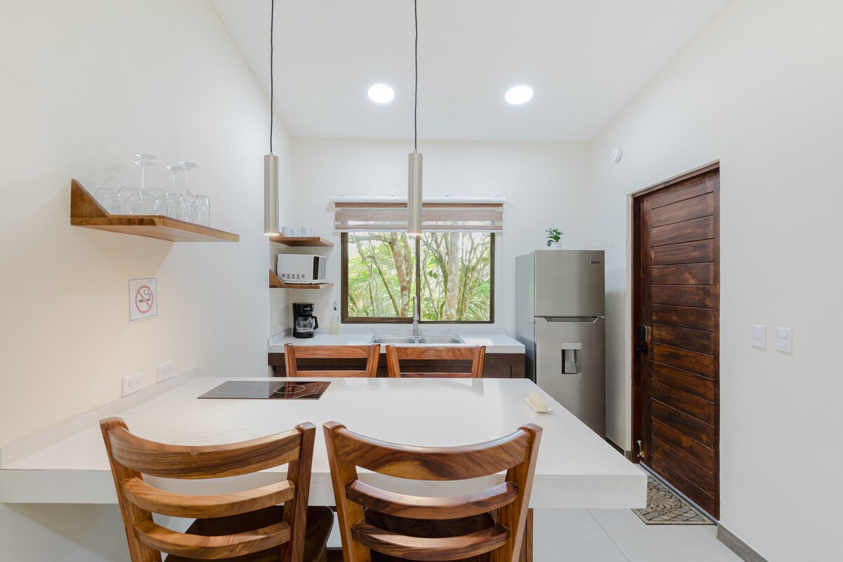 Pequeños bungalows nuevos tipo loft a 1 km de Playa negra. Privado y completamente equipado para disfrutar cómodamente su viaje. Estamos en un lugar privilegiado cerca de las más lindas playas como Avellanas, Junquillal y Playa Negra(2 min en auto), una de las mejores olas de Costa Rica. Ademas a poca distancia caminando de restaurantes y minimarkets. Cuenta con Wifi de alta velocidad, A/C, cocina equipada, cama queen, baño privado con agua caliente, y terraza propia. Piscina compartida