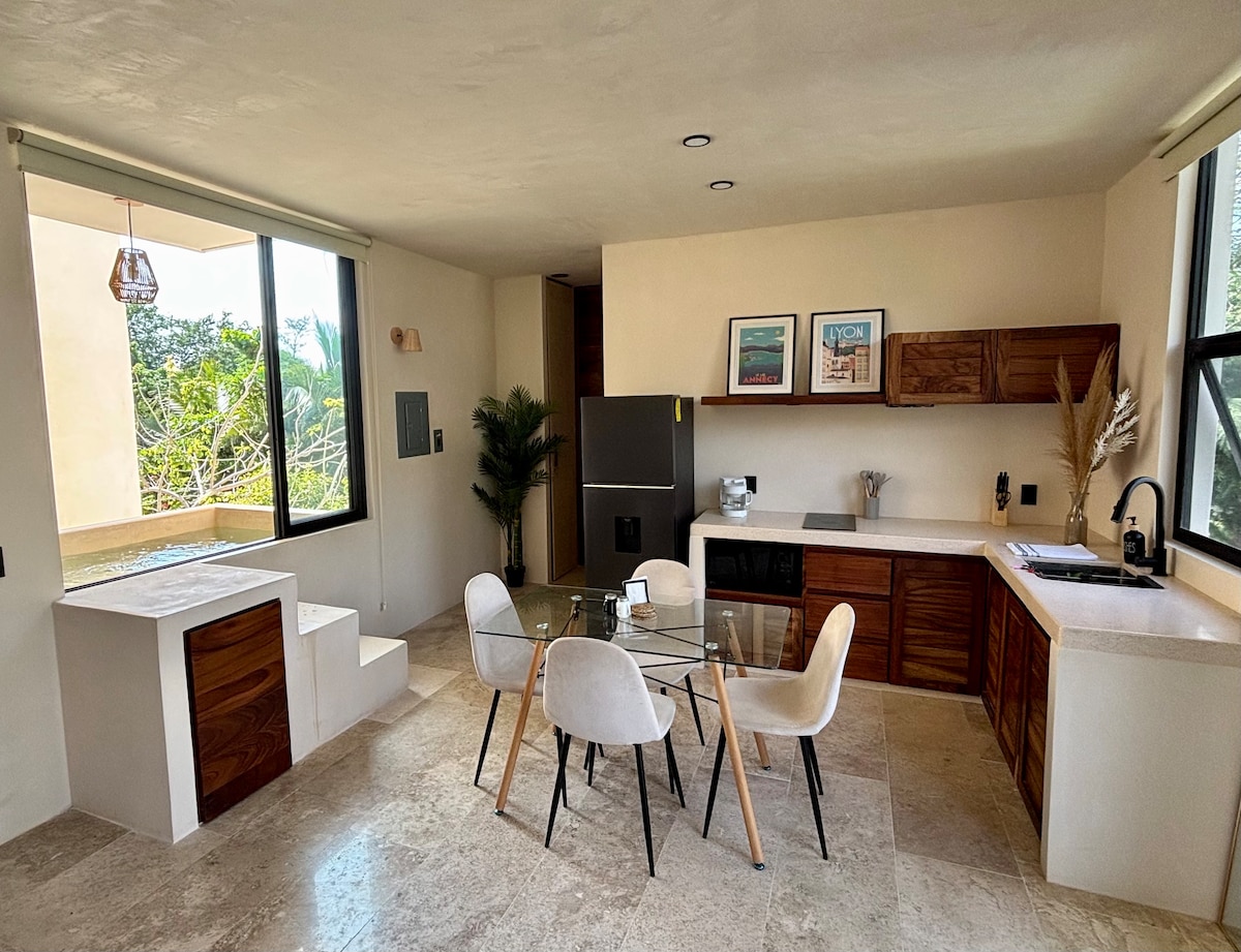 Villa totalmente equipada con cocina, habitación con cama king size y aire acondicionado, baño amplio con ducha espaciosa, alberca privada y una terraza ideal para relajarte. Decorada con un estilo original y detalles artísticos únicos, esta villa ofrece un ambiente de tranquilidad, privacidad y confort. Perfecta para parejas que buscan una escapada especial.