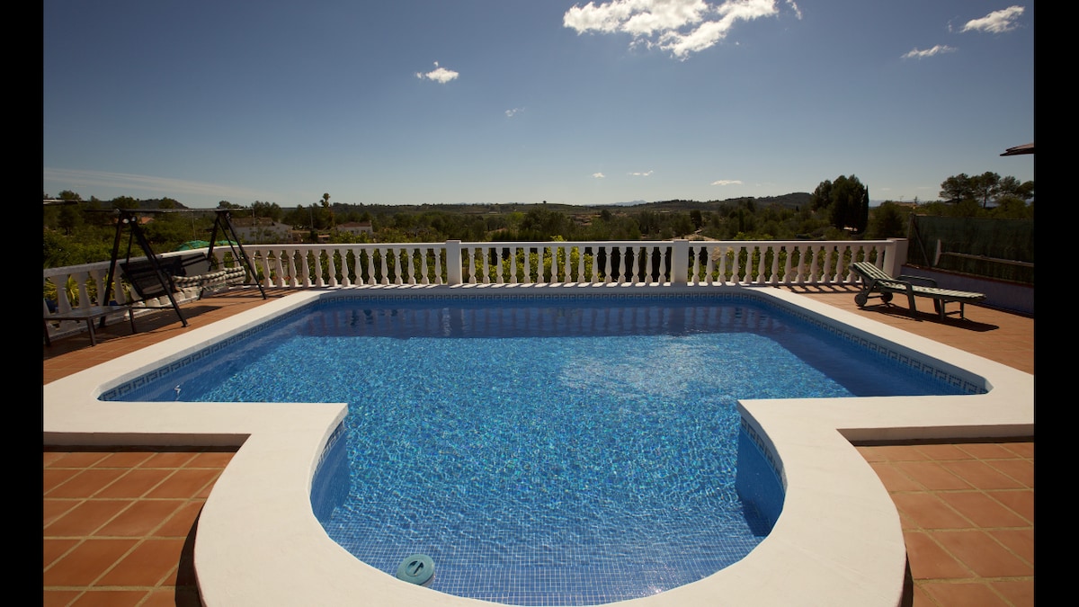 Espectaculares vistas y tranquilidad. Preciosa casa de campo tradicional, renovada con todas las comodidades y con vistas al Parque Natural del Valle de la Murta. La finca de 2 hectáreas de naranjos trepa a través de terrazas hasta el pinar de la montaña, y cuenta con una enorme piscina privada encalada. La casa es un remanso de paz con las mejores temperaturas durante todo el año, con preciosos atardeceres y a solo 5 minutos en coche de los servicios del pueblo, 20 de la playa y 40 de Valencia.