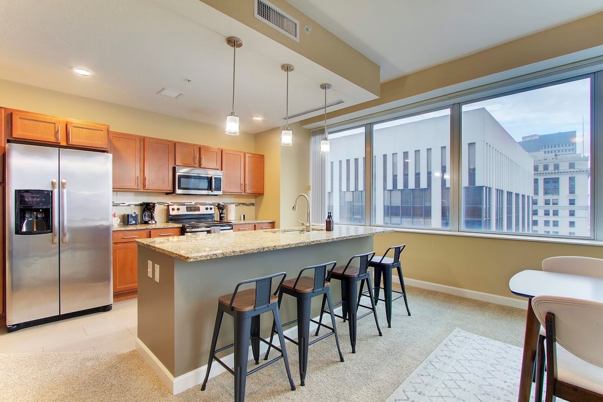 Hospédate en el edificio de lujo más emblemático de Cleveland, un condominio diseñado para huéspedes que esperan alta calidad, comodidad y estilo. Con una puntuación de 98/100, estás a pocos pasos de los mejores restaurantes, entretenimiento y atracciones de la ciudad, luego regresa a tu oasis privado de lujo para relajarte y recargar energías. ✔️ Condominio de lujo de 2 dormitorios y 2 baños Vida ✔️ de concepto abierto Cocina moderna✔️ completa ✔️ Televisores inteligentes Wifi ✔️ de alta velocidad ✔️ Espacio de trabajo ✔️ Lavadora/Secadora. ✔️ Estacionamiento disponible $ Seguridad ✔️ las 24 horas, 7 días a la semana. ✔️ Centro de fitness ¡Ver más a continuación!