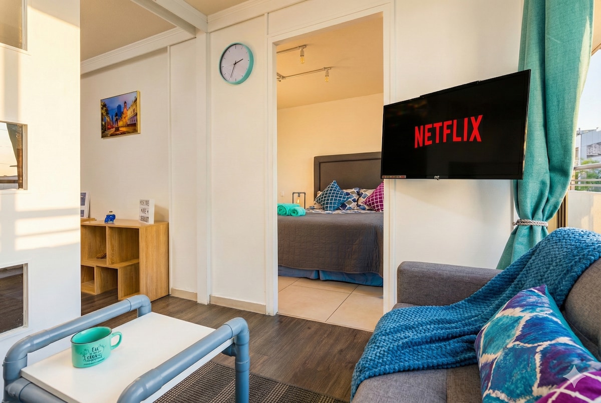 Moderno y acogedor departamento con aire acondicionado en el corazón de Santiago. A pasos del metro y del Centro Histórico, rodeado de museos, mercados y restaurantes. Cama king, cocina equipada, balcón y wifi rápido, ideal para viajes o estadías largas. Edificio seguro con conserje 24/7. Atención personalizada, check-in flexible y recomendaciones locales para que disfrutes la ciudad como un residente, con comodidad y tranquilidad.