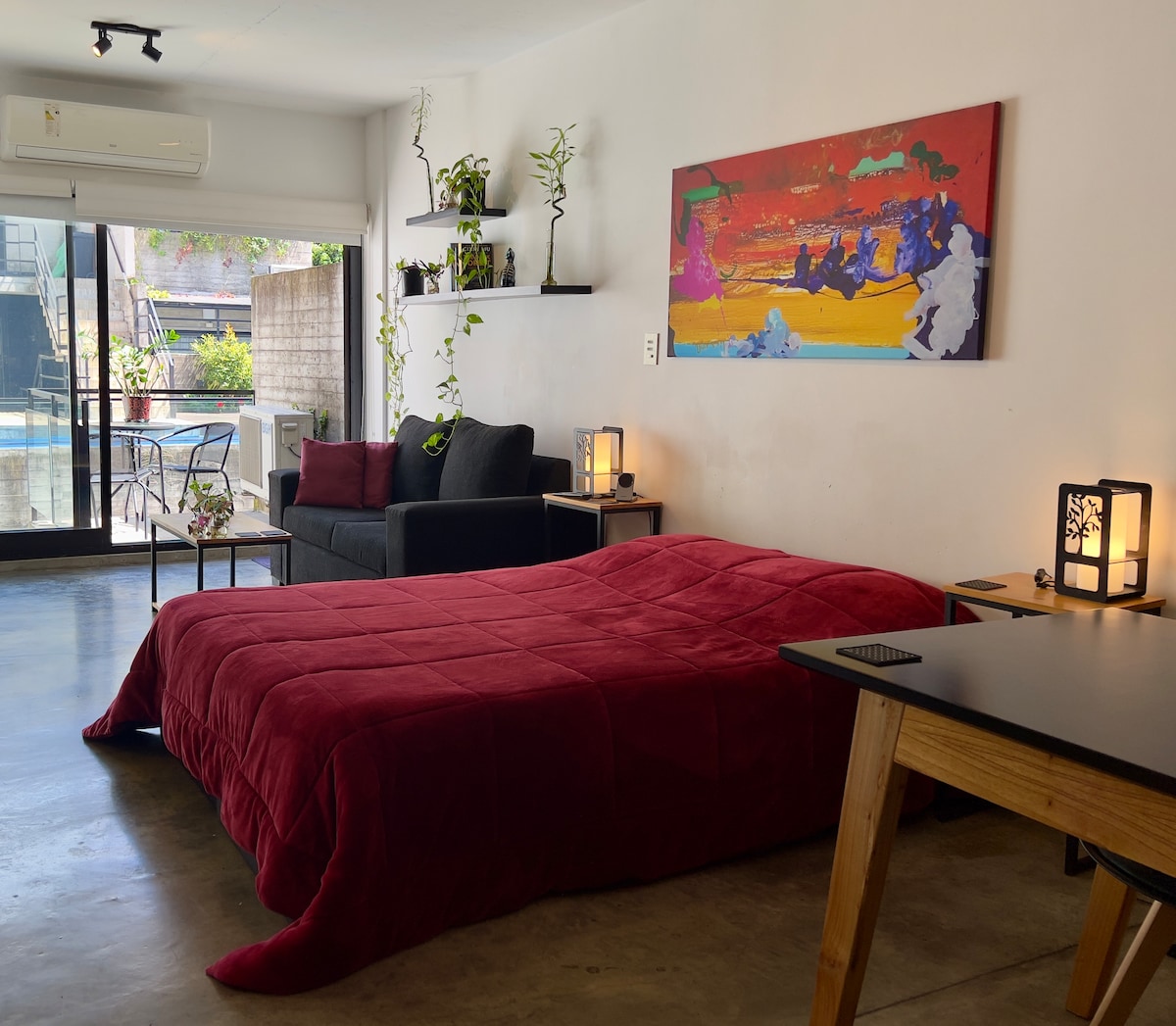 Luminoso, tranquilo y decorado con buen gusto, este estudio se encuentra a pocos metros de Plaza Armenia, en el corazón de Palermo Soho. Disfruta de un ambiente amplio y acogedor con internet rápido de 500 Mb/s, ideal para trabajar o ver películas. Sorprendentemente silencioso y confortable, con cortinas blackout para un descanso profundo. También hay espacio para yoga o ejercicio ligero, con equipo opcional a pedido. A pasos de cafés, restaurantes, tiendas y la feria artesanal de fin de semana.