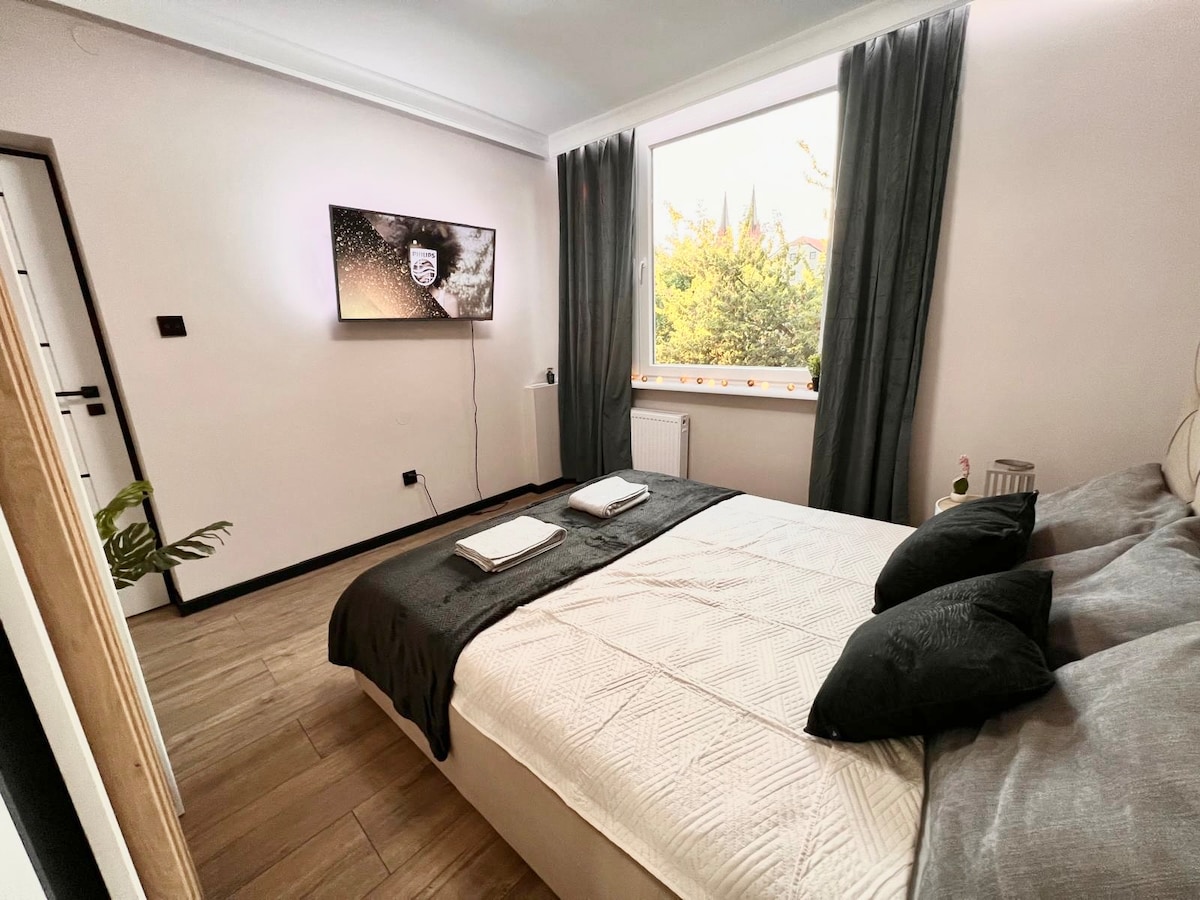 Un lugar elegante para alojarse en el centro de la ciudad. Le invitamos a una casa de vecindad histórica y elegante, recientemente restaurada. Se encuentra cerca del Ayuntamiento y la Plaza del Mercado Viejo. El apartamento está cómodamente amueblado, el dormitorio es acogedor e íntimo.