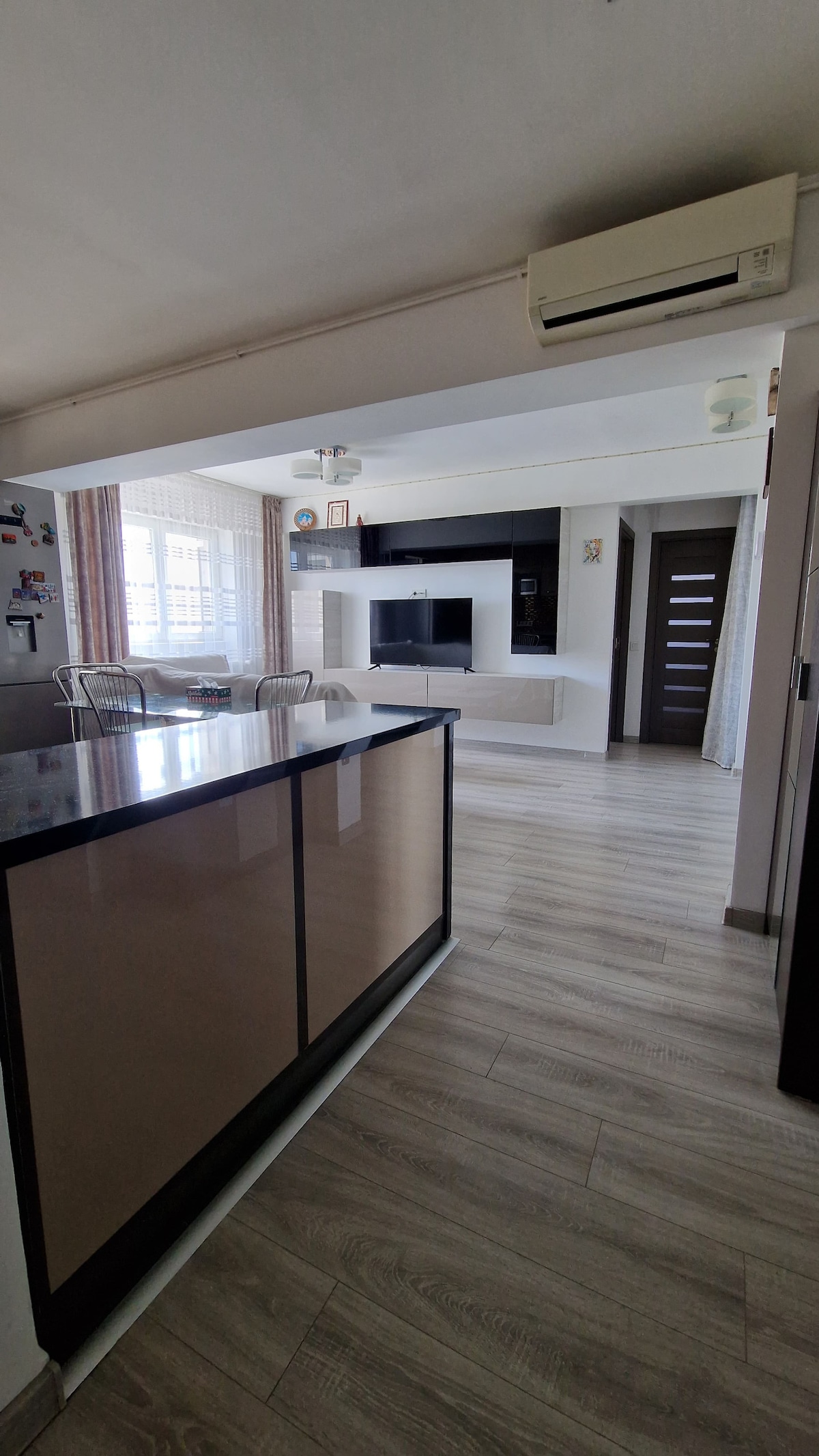 Apartament modern, situat chiar în centrul orașului, la câțiva pași de restaurante, cafenele și atracții. Dispune de living spațios, dormitor confortabil cu pat matrimonial, bucătărie complet utilată, Wi-Fi rapid, aer condiționat și TV. Ideal pentru city-break, călătorii de afaceri sau sejururi relaxante.